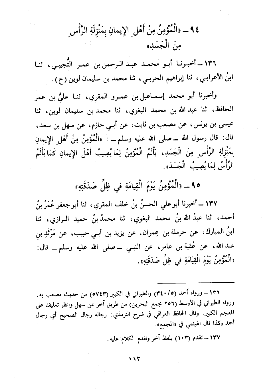136 - أَخْبَرَنَا أَبُو مُحَمَّدٍ عَبْدُ الرَّحْمَنِ بْنُ عُمَرَ التُّجِيبِيُّ، ثنا ابْنُ الْأَعْرَابِيِّ، ثنا إِبْرَاهِيمُ الْحَرْبِيُّ، ثنا مُحَمَّدُ بْنُ سُلَيْمَانَ لُوَيْنُ، ح وَأَخْبَرَنَا أَبُو مُحَمَّدٍ إِسْمَاعِيلُ بْنُ عَمْرٍو الْمُقْرِئُ، ثنا عَلِيُّ بْنُ عُمَرَ الْحَافِظُ، ثنا عَبْدُ اللَّهِ بْنُ مُحَمَّدٍ الْبَغَوِيُّ، ثنا مُحَمَّدُ بْنُ سُلَيْمَانَ لُوَيْنٌ، ثنا عِيسَى بْنُ يُونُسَ، عَنْ مُصْعَبِ بْنِ ثَابِتٍ، عَنْ أَبِي حَازِمٍ، عَنْ سَهْلِ بْنِ سَعْدٍ، قَالَ: قَالَ رَسُولُ اللَّهِ صَلَّى اللهُ عَلَيْهِ وَسَلَّمَ: «§الْمُؤْمِنُ مِنْ أَهْلِ الْإِيمَانِ بِمَنْزِلَةِ الرَّأْسِ مِنَ الْجَسَدِ، يَأْلَمُ الْمُؤْمِنُ لِمَا يُصِيبُ أَهْلَ الْإِيمَانِ كَمَا يَأْلَمُ الرَّأْسُ لِمَا يُصِيبُ الْجَسَدَ»