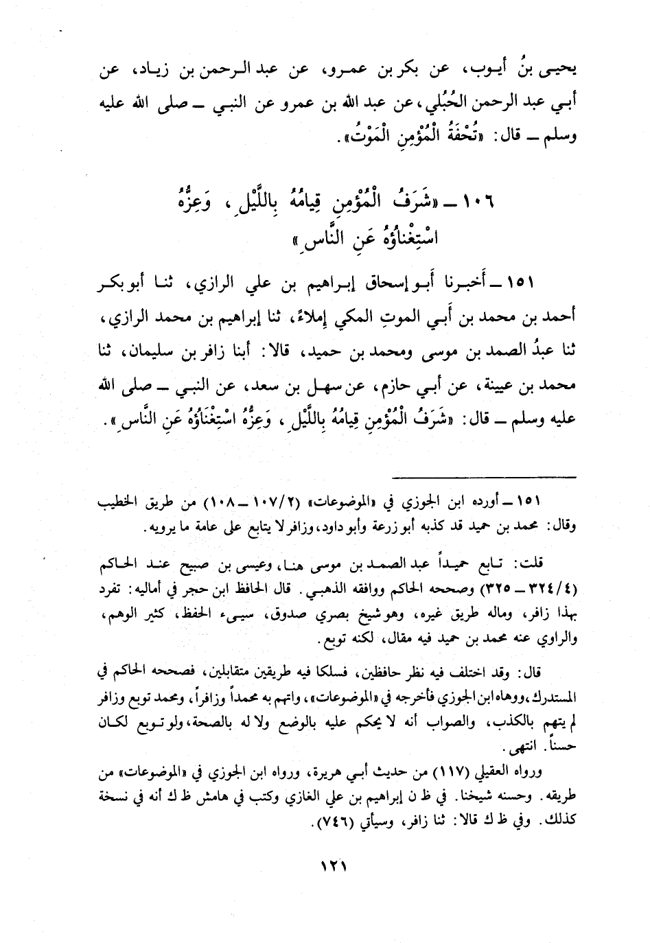 151 - أَخْبَرَنَا أَبُو إِسْحَاقَ إِبْرَاهِيمُ بْنُ عَلِيٍّ الرَّازِيُّ، ثنا أَبُو بَكْرٍ أَحْمَدُ بْنُ مُحَمَّدِ بْنِ أَبِي الْمَوْتِ الْمَكِّيُّ إِمْلَاءً، ثنا إِبْرَاهِيمُ بْنُ مُحَمَّدٍ الرَّازِيُّ، ثنا عَبْدُ الصَّمَدِ بْنُ مُوسَى وَمُحَمَّدُ بْنُ حُمَيْدٍ، قَالَا: أبنا زَافِرُ بْنُ سُلَيْمَانَ، ثنا مُحَمَّدُ بْنُ عُيَيْنَةَ، عَنْ أَبِي حَازِمٍ، عَنْ سَهْلِ بْنِ سَعْدٍ، عَنِ النَّبِيِّ صَلَّى اللهُ عَلَيْهِ وَسَلَّمَ قَالَ: «§شَرَفُ الْمُؤْمِنِ قِيَامُهُ بِاللَّيْلِ، وَعِزُّهُ اسْتَغْنَاؤُهُ عَنِ النَّاسِ»