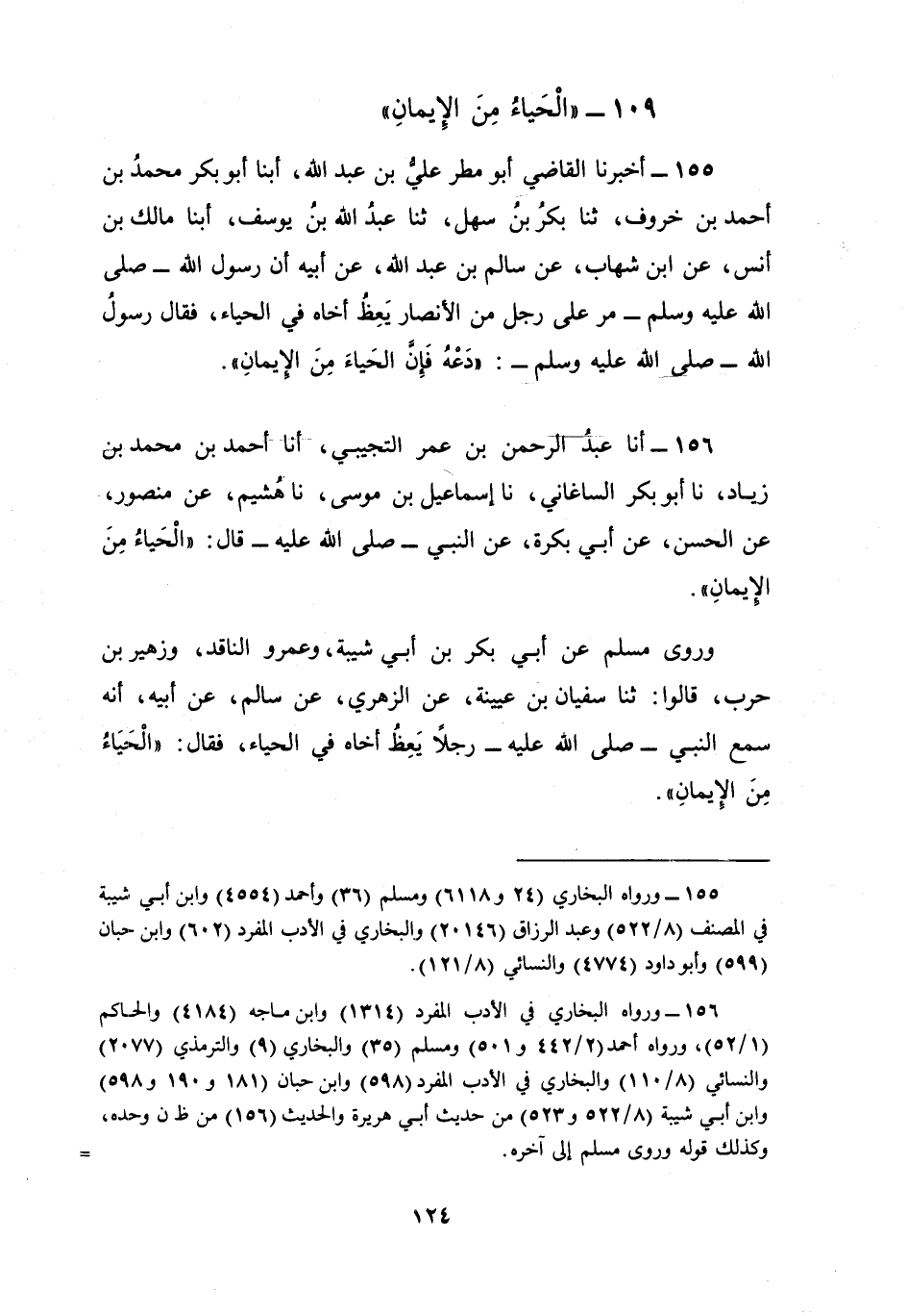 156 - أنا عَبْدُ الرَّحْمَنِ بْنُ عُمَرَ التُّجِيبِيُّ، أنا أَحْمَدُ بْنُ مُحَمَّدِ بْنِ زِيَادٍ، نا أَبُو بَكْرٍ السَّاغَانِيُّ، نا إِسْمَاعِيلُ بْنُ مُوسَى، نا هُشَيْمٌ، عَنْ مَنْصُورٍ، عَنِ الْحَسَنِ، عَنْ أَبِي بَكْرَةَ، عَنِ النَّبِيِّ صَلَّى اللهُ عَلَيْهِ وَسَلَّمَ قَالَ: «§الْحَيَاءُ مِنَ الْإِيمَانِ» وَرَوَى مُسْلِمٌ، عَنْ أَبِي بَكْرِ بْنِ أَبِي شَيْبَةَ، وَعَمْرٌو النَّاقِدُ وَزُهَيْرُ بْنُ حَرْبٍ قَالُوا: ثنا سُفْيَانُ بْنُ عُيَيْنَةَ، عَنِ الزُّهْرِيِّ، عَنْ سَالِمٍ، عَنْ أَبِيهِ أَنَّهُ سَمِعَ النَّبِيُّ صَلَّى اللهُ عَلَيْهِ وَسَلَّمَ رَجُلًا يَعِظُ أَخَاهُ فِي الْحَيَاءِ فَقَالَ: «الْحَيَاءُ مِنَ الْإِيمَانِ»