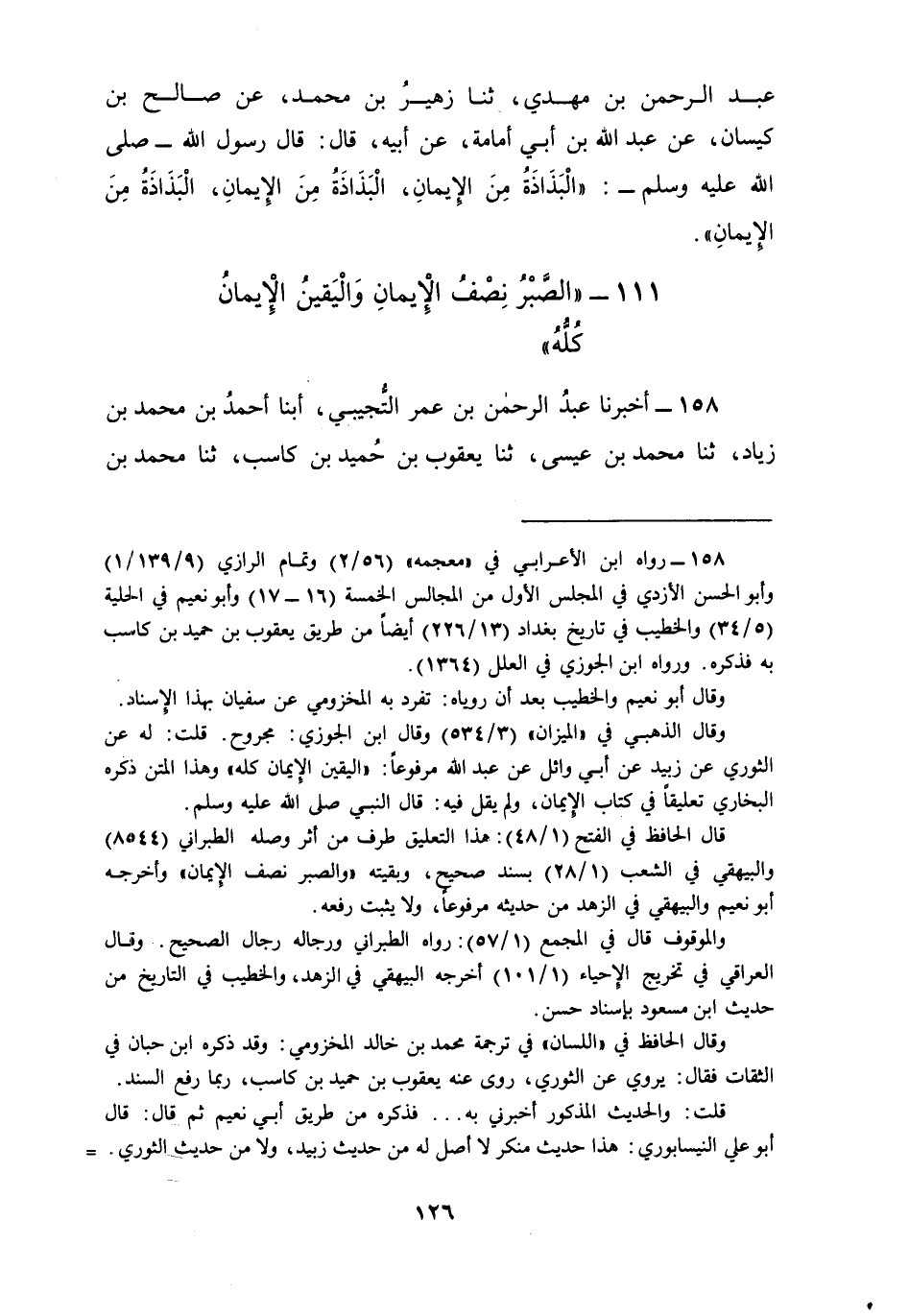 158 - أَخْبَرَنَا عَبْدُ الرَّحْمَنِ بْنُ عُمَرَ التُّجِيبِيُّ، أبنا أَحْمَدُ بْنُ مُحَمَّدِ بْنِ زِيَادِ ثنا مُحَمَّدُ بْنُ عِيسَى، ثنا يَعْقُوبُ بْنُ حُمَيْدِ بْنِ كَاسِبٍ، ثنا مُحَمَّدُ بْنُ خَالِدٍ الْمَخْزُومِيُّ، عَنْ سُفْيَانَ الثَّوْرِيِّ، عَنْ زُبَيْدٍ هُوَ ابْنُ الْحَرْبِ عَنْ أَبِي وَائِلٍ، عَنْ عَبْدِ اللَّهِ، قَالَ: قَالَ رَسُولُ اللَّهِ صَلَّى اللهُ عَلَيْهِ وَسَلَّمَ: §«الصَّبْرُ نِصْفُ الْإِيمَانِ وَالْيَقِينُ الْإِيمَانُ كُلُّهُ»