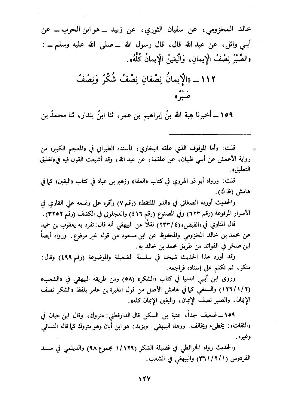 §الْإِيمَانُ نِصْفَانِ نِصْفٌ شُكْرٌ، وَنِصْفٌ صَبْرٌ