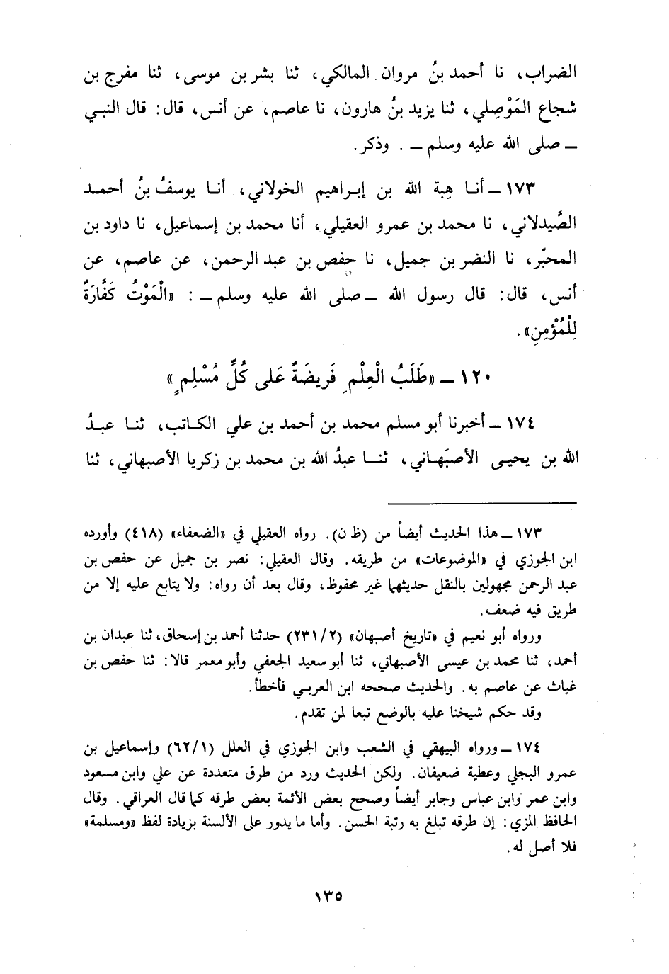 174 - أَخْبَرَنَا أَبُو مُسْلِمٍ مُحَمَّدُ بْنُ أَحْمَدَ بْنِ عَلِيٍّ الْكَاتِبُ، ثنا عَبْدُ اللَّهِ بْنُ يَحْيَى الْأَصْبَهَانِيُّ، ثنا عَبْدُ اللَّهِ بْنُ مُحَمَّدِ بْنِ زَكَرِيَّا الْأَصْبَهَانِيُّ، ثنا إِسْمَاعِيلُ بْنُ عَمْرٍو الْبَجَلِيُّ، ثنا مِسْعَرٌ، عَنْ عَطِيَّةَ الْعَوْفِيِّ عَنْ أَبِي سَعِيدٍ الْخُدْرِيِّ، قَالَ: قَالَ رَسُولُ اللَّهِ صَلَّى اللهُ عَلَيْهِ وَسَلَّمَ: §«طَلَبُ الْعِلْمِ فَرِيضَةٌ عَلَى كُلِّ مُسْلِمٍ»