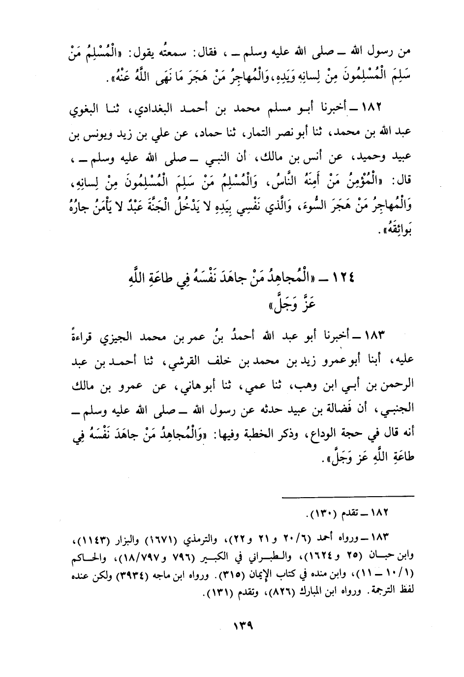 183 - أَخْبَرَنَا أَبُو عَبْدِ اللَّهِ أَحْمَدُ بْنُ عُمَرَ بْنِ مُحَمَّدٍ الْجِيزِيُّ قِرَاءَةً عَلَيْهِ، أبنا أَبُو عَمْرِو زَيْدُ بْنُ مُحَمَّدِ بْنِ خَلَفٍ الْقُرَشِيُّ، ثنا أَحْمَدُ بْنُ عَبْدِ الرَّحْمَنِ ابْنِ أَخِي ابْنِ وَهْبٍ، ثنا عَمِّي، ثنا أَبُو هَانِي، عَنْ عَمْرِو بْنِ مَالِكٍ الْجَنْبِيِّ، أَنَّ فَضَالَةَ بْنَ عُبَيْدٍ حَدَّثَهُ عَنْ رَسُولِ اللَّهِ صَلَّى اللهُ عَلَيْهِ وَسَلَّمَ أَنَّهُ قَالَ فِي حَجَّةِ الْوَدَاعِ وَذَكَرَ الْخُطْبَةَ وَفِيهَا: §«وَالْمُجَاهِدُ مَنْ جَاهَدَ نَفْسَهُ فِي طَاعَةِ اللَّهِ عَزَّ وَجَلَّ»