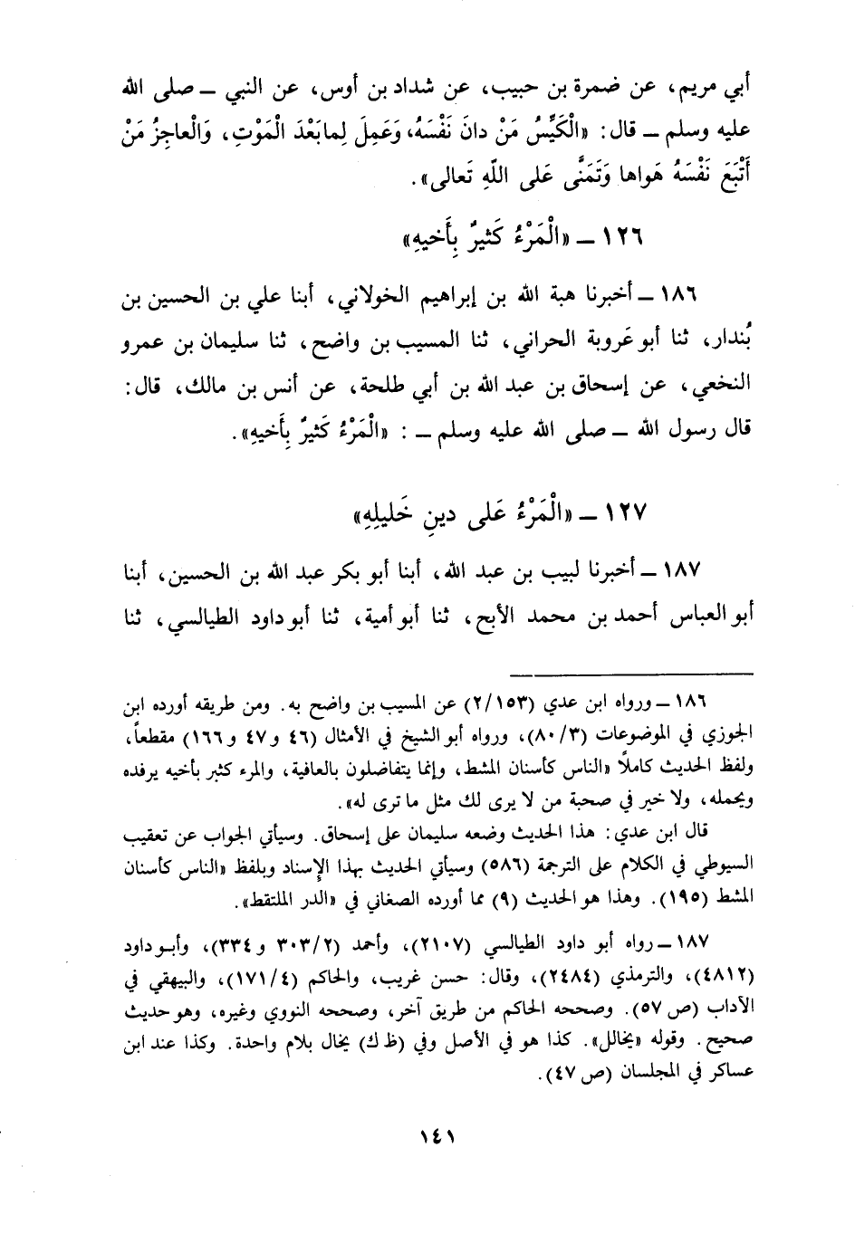 187 - أَخْبَرَنَا لَبِيبُ بْنُ عَبْدِ اللَّهِ، أبنا أَبُو بَكْرٍ عَبْدُ اللَّهِ بْنُ الْحُسَيْنِ، أبنا أَبُو الْعَبَّاسِ أَحْمَدُ بْنُ مُحَمَّدٍ الْأَبَحُّ، ثنا أَبُو أُمَيَّةَ، ثنا أَبُو دَاوُدَ الطَّيَالِسِيُّ، ثنا زُهَيْرُ بْنُ مُحَمَّدٍ التَّمِيمِيُّ، حَدَّثَنِي مُوسَى بْنُ وَرْدَانَ، عَنْ أَبِي هُرَيْرَةَ، أَنَّ رَسُولَ اللَّهِ صَلَّى اللهُ عَلَيْهِ وَسَلَّمَ قَالَ: §«الْمَرْءُ عَلَى دِينِ خَلِيلِهِ فَلْيَنْظُرْ أَحَدُكُمْ مَنْ يُخَالِلُ»