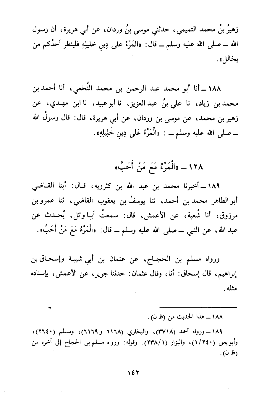 188 - أنا أَبُو مُحَمَّدٍ عَبْدُ الرَّحْمَنِ بْنُ مُحَمَّدٍ النَّخَعِيُّ، أنا أَحْمَدُ بْنُ مُحَمَّدِ بْنِ زِيَادٍ، نا عَلِيُّ بْنُ عَبْدِ الْعَزِيزِ، نا أَبُو عُبَيْدٍ، نا ابْنُ مَهْدِيٍّ، عَنْ زُهَيْرِ بْنِ مُحَمَّدٍ، عَنْ مُوسَى بْنِ وَرْدَانَ، عَنْ أَبِي هُرَيْرَةَ، قَالَ: قَالَ رَسُولُ اللَّهِ صَلَّى اللهُ عَلَيْهِ وَسَلَّمَ: §«الْمَرْءُ عَلَى دِينِ خَلِيلِهِ»