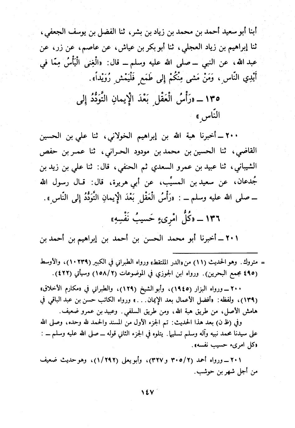 200 - أَخْبَرَنَا هِبَةُ اللَّهِ بْنُ إِبْرَاهِيمَ الْخَوْلَانِيُّ، ثنا عَلِيُّ بْنُ الْحُسَيْنِ الْقَاضِي، ثنا الْحُسَيْنُ بْنُ مُحَمَّدِ بْنِ مَوْدُودِ الْحَرَّانِيُّ، ثنا عُمَرُ بْنُ حَفْصٍ الشَّيْبَانِيُّ، ثنا عُبَيْدُ بْنُ عَمْرٍو السَّعْدِيُّ ثُمَّ الْحَنَفِيُّ، قَالَ: ثنا عَلِيُّ بْنُ زَيْدِ بْنِ جُدْعَانَ، عَنْ سَعِيدِ بْنِ الْمُسَيِّبِ، عَنْ أَبِي هُرَيْرَةَ، قَالَ: قَالَ رَسُولُ اللَّهِ صَلَّى اللهُ عَلَيْهِ وَسَلَّمَ: §«رَأْسُ الْعَقْلِ بَعْدَ الْإِيمَانِ التَّوَدُّدُ إِلَى النَّاسِ»
