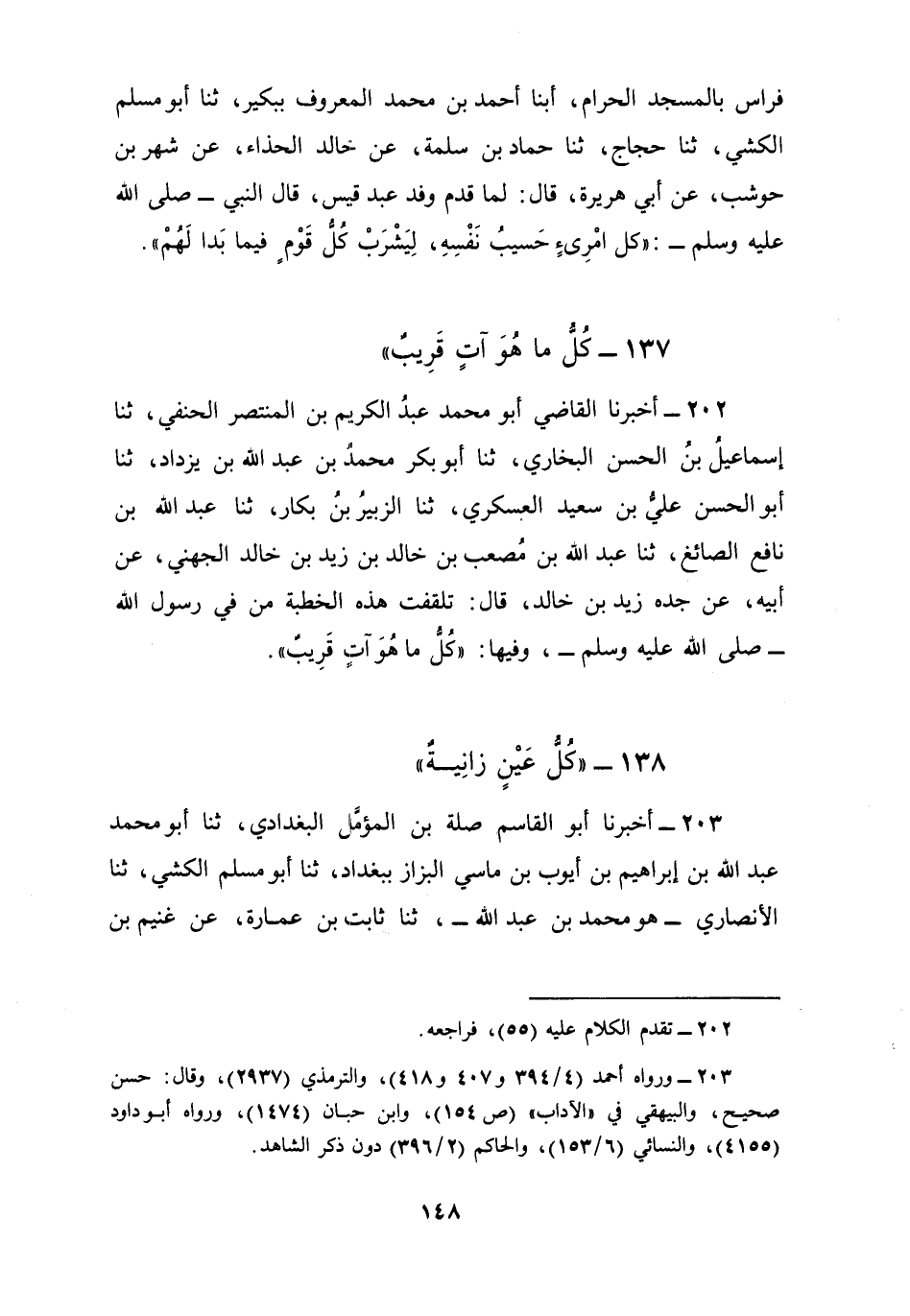 202 - أَخْبَرَنَا الْقَاضِي أَبُو مُحَمَّدٍ عَبْدُ الْكَرِيمِ بْنُ الْمُنْتَصِرِ الْحَنَفِيُّ، ثنا إِسْمَاعِيلُ بْنُ الْحَسَنِ الْبُخَارِيُّ، ثنا أَبُو بَكْرٍ مُحَمَّدُ بْنُ عَبْدِ اللَّهِ بْنِ يَزْدَادَ، ثنا أَبُو الْحَسَنِ عَلِيُّ بْنُ سَعِيدٍ الْعَسْكَرِيُّ، ثنا الزُّبَيْرُ بْنُ بَكَّارٍ، ثنا عَبْدُ اللَّهِ بْنُ نَافِعٍ الصَّائِغُ، ثنا عَبْدُ اللَّهِ بْنُ مُصْعَبِ بْنِ خَالِدِ بْنِ زَيْدِ بْنِ خَالِدٍ الْجُهَنِيُّ، عَنْ أَبِيهِ، عَنْ جَدِّهِ زَيْدِ بْنِ خَالِدٍ قَالَ: تَلَقَّفْتُ هَذِهِ الْخُطْبَةَ مِنْ فِي رَسُولِ اللَّهِ صَلَّى اللهُ عَلَيْهِ وَسَلَّمَ وَفِيهَا: §«كُلُّ مَا هُوَ آتٍ قَرِيبٌ»