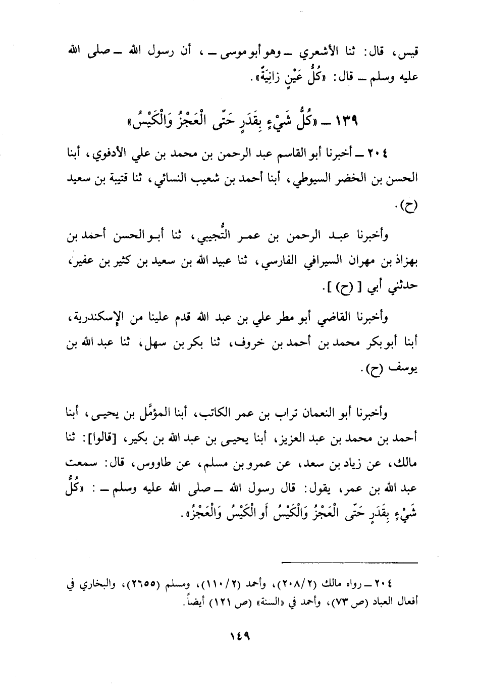 204 - أَخْبَرَنَا أَبُو الْقَاسِمِ عَبْدُ الرَّحْمَنِ بْنُ مُحَمَّدِ بْنِ عَلِيٍّ الْأَدْفُوِيُّ، أبنا الْحَسَنُ بْنُ الْخَضِرِ السِّيُوطِيُّ، أبنا أَحْمَدُ بْنُ شُعَيْبٍ النَّسَائِيُّ، ثنا قُتَيْبَةُ بْنُ سَعِيدٍ، ح وَأَخْبَرَنَا عَبْدُ الرَّحْمَنِ بْنُ عُمَرَ التُّجِيبِيُّ، ثنا أَبُو الْحَسَنِ أَحْمَدُ بْنُ بُهْزَاذَ بْنِ مِهْرَانَ السَّيْرَافِيُّ الْفَارِسِيُّ، ثنا عُبَيْدُ اللَّهِ بْنُ سَعِيدِ بْنِ كَثِيرِ بْنِ عُفَيْرٍ، حَدَّثَنِي أَبِي، ح وَأَخْبَرَنَا الْقَاضِي أَبُو مَطَرٍ عَلِيُّ بْنُ عَبْدِ اللَّهِ قَدِمَ عَلَيْنَا مِنَ الْإِسْكَنْدَرِيَّةِ، أبنا أَبُو بَكْرٍ مُحَمَّدُ بْنُ أَحْمَدَ بْنِ خَرُوفٍ، ثنا بَكْرُ بْنُ سَهْلٍ، ثنا عَبْدُ اللَّهِ بْنُ يُوسُفَ، ح، وَأَخْبَرَنَا أَبُو النُّعْمَانِ تُرَابُ بْنُ عُمَرَ الْكَاتِبُ، أبنا الْمُؤَمَّلُ بْنُ يَحْيَى، أبنا أَحْمَدُ بْنُ مُحَمَّدِ بْنِ عَبْدِ الْعَزِيزِ، أبنا يَحْيَى بْنُ عَبْدِ اللَّهِ بْنِ بُكَيْرٍ قَالُوا: ثنا مَالِكٌ، عَنْ زِيَادِ بْنِ سَعْدٍ، عَنْ عَمْرِو بْنِ مُسْلِمٍ، عَنْ طَاوُسٍ، قَالَ: سَمِعْتُ عَبْدَ اللَّهِ بْنَ عَمْرٍو، يَقُولُ: قَالَ رَسُولُ اللَّهِ صَلَّى اللهُ عَلَيْهِ وَسَلَّمَ: §«كُلُّ شَيْءٍ بِقَدَرٍ حَتَّى الْعَجْزُ وَالْكَيْسُ» أَوِ الْكَيْسُ وَالْعَجْزِ