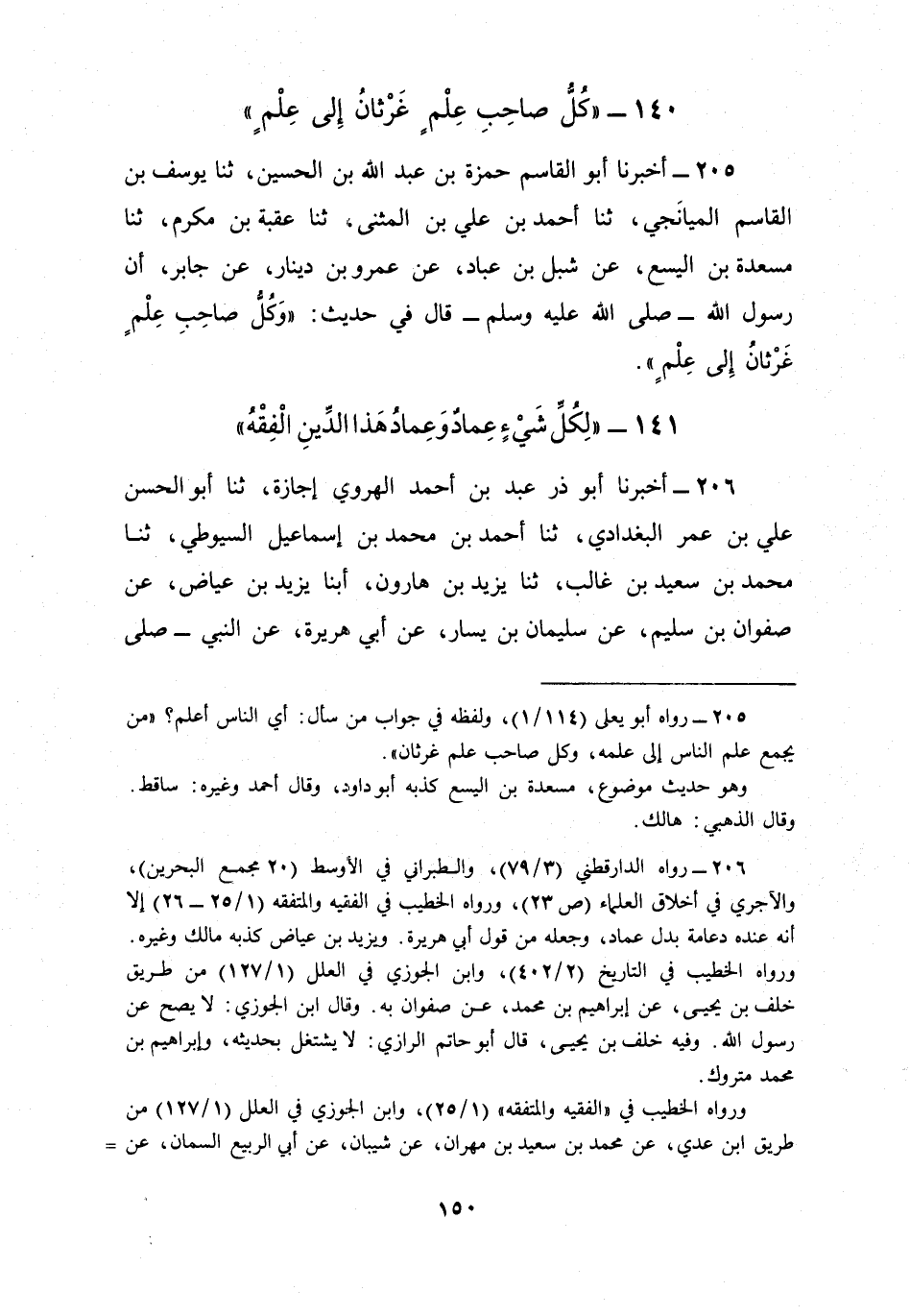 205 - أَخْبَرَنَا أَبُو الْقَاسِمِ حَمْزَةُ بْنُ عَبْدِ اللَّهِ بْنِ الْحُسَيْنِ، ثنا يُوسُفُ بْنُ الْقَاسِمِ الْمَيَانَجِيُّ، ثنا أَحْمَدُ بْنُ عَلِيِّ بْنِ الْمُثَنَّى، ثنا عُقْبَةُ بْنُ مُكْرَمٍ، ثنا مَسْعَدَةُ بْنُ الْيَسَعِ، عَنْ شِبْلِ بْنِ عَبَّادٍ، عَنْ عَمْرِو بْنِ دِينَارٍ، عَنْ جَابِرٍ، أَنَّ رَسُولَ اللَّهِ صَلَّى اللهُ عَلَيْهِ وَسَلَّمَ قَالَ فِي حَدِيثٍ: §«وَكُلُّ صَاحِبِ عِلْمٍ غَرْثَانُ إِلَى عِلْمٍ»