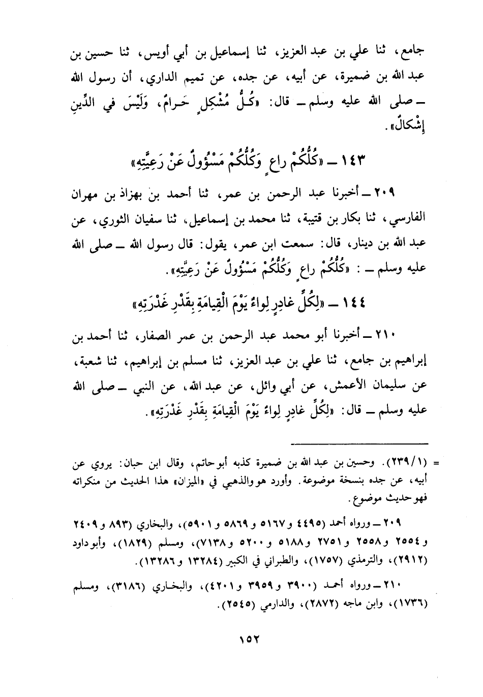 209 - أَخْبَرَنَا عَبْدُ الرَّحْمَنِ بْنُ عُمَرَ، ثنا أَحْمَدُ بْنُ بُهْزَاذَ بْنِ مِهْرَانَ الْفَارِسِيُّ، ثنا بَكَّارُ بْنُ قُتَيْبَةَ، ثنا مُحَمَّدُ بْنُ إِسْمَاعِيلَ، ثنا سُفْيَانُ الثَّوْرِيُّ، عَنْ عَبْدِ اللَّهِ بْنِ دِينَارٍ، قَالَ: سَمِعْتُ ابْنَ عَمْرٍو، يَقُولُ: قَالَ رَسُولُ اللَّهِ صَلَّى اللهُ عَلَيْهِ وَسَلَّمَ: «§كُلُّكُمْ رَاعٍ وَكُلُّكُمْ مَسْئُولٌ، عَنْ رَعِيَّتِهِ»