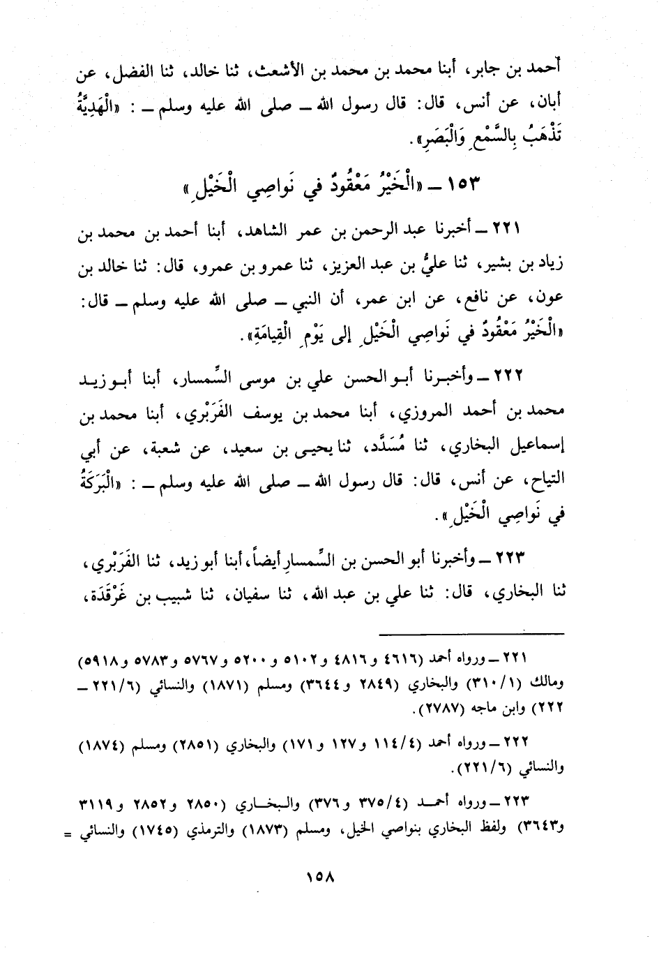 223 - وَأَخْبَرَنَا أَبُو الْحَسَنِ بْنُ السِّمْسَارِ، أَيْضًا، أبنا أَبُو زَيْدٍ، ثنا الْفَرَبْرِيُّ، ثنا الْبُخَارِيُّ، قَالَ: ثنا عَلِيُّ بْنُ عَبْدِ اللَّهِ، ثنا سُفْيَانُ، ثنا شَبِيبُ بْنُ غَرْقَدَةَ، قَالَ: سَمِعْتُ عُرْوَةَ يَعْنِي الْبَارِقِيَّ قَالَ: سَمِعْتُ رَسُولَ اللَّهِ صَلَّى اللهُ عَلَيْهِ وَسَلَّمَ يَقُولُ: §«الْخَيْرُ مَعْقُودٌ فِي نَوَاصِي الْخَيْلِ إِلَى يَوْمِ الْقِيَامَةِ»