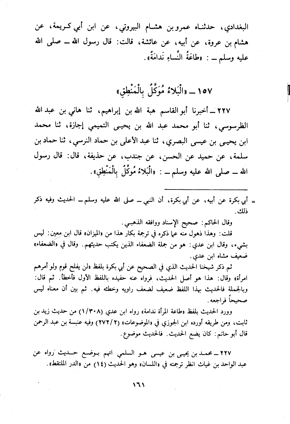 227 - أَخْبَرَنَا أَبُو الْقَاسِمِ هِبَةُ اللَّهِ بْنُ إِبْرَاهِيمَ، ثنا هَانِي بْنُ عَبْدِ اللَّهِ الطَّرَسُوسِيُّ، ثنا أَبُو مُحَمَّدٍ عَبْدُ اللَّهِ بْنُ يَحْيَى التَّمِيمِيُّ، إِجَازَةً، ثنا مُحَمَّدُ بْنُ يَحْيَى بْنِ عِيسَى الْبَصْرِيُّ، ثنا عَبْدُ الْأَعْلَى بْنُ حَمَّادٍ النَّرْسِيُّ، ثنا حَمَّادُ بْنُ سَلَمَةَ، عَنْ حُمَيْدٍ، عَنِ الْحَسَنِ، عَنْ جُنْدُبٍ، عَنْ حُذَيْفَةَ، قَالَ: قَالَ رَسُولُ اللَّهِ صَلَّى اللهُ عَلَيْهِ وَسَلَّمَ: §«الْبَلَاءُ مُوَكَّلٌ بِالْمَنْطِقِ»