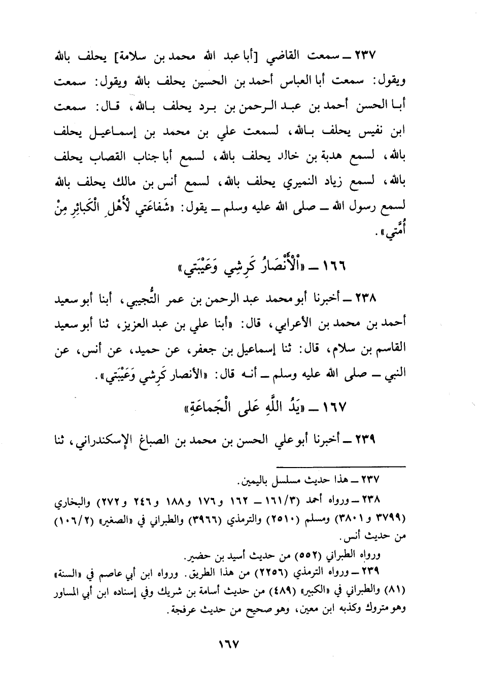 237 - سَمِعْتُ الْقَاضِيَ أَبَا عَبْدِ اللَّهِ مُحَمَّدُ بْنُ سَلَامَةَ يَحْلِفُ بِاللَّهِ وَيَقُولُ: سَمِعْتُ أَبَا الْعَبَّاسِ أَحْمَدَ بْنَ الْحُسَيْنِ يَحْلِفُ بِاللَّهِ وَيَقُولُ: سَمِعْتُ أَبَا الْحَسَنِ أَحْمَدَ بْنَ عَبْدِ الرَّحْمَنِ بْنِ بُرْدٍ يَحْلِفُ بِاللَّهِ قَالَ: سَمِعْتُ ابْنَ نَفِيسٍ، يَحْلِفُ بِاللَّهِ لَسَمِعْتُ عَلِيَّ بْنَ مُحَمَّدِ بْنِ إِسْمَاعِيلَ يَحْلِفُ بِاللَّهِ لَسَمِعَ هُدْبَةَ بْنَ خَالِدٍ يَحْلِفُ بِاللَّهِ لَسَمِعَ أَبَا جَنَابٍ الْقَصَّابَ يَحْلِفُ بِاللَّهِ لَسَمِعَ زِيَادًا النُّمَيْرِيَّ يَحْلِفُ بِاللَّهِ لَسَمِعَ أَنَسَ بْنَ مَالِكٍ يَحْلِفُ بِاللَّهِ لَسَمِعَ رَسُولَ اللَّهِ صَلَّى اللهُ عَلَيْهِ وَسَلَّمَ يَقُولُ: §«شَفَاعَتِي لِأَهْلِ الْكَبَائِرِ مِنْ أُمَّتِي»