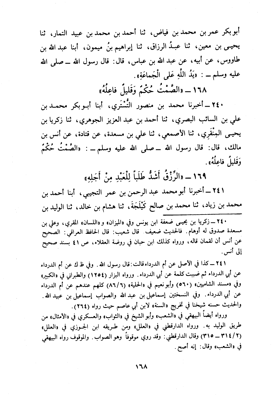 240 - أَخْبَرَنَا مُحَمَّدُ بْنُ مَنْصُورٍ التُّسْتَرِيُّ، أبنا أَبُو بَكْرٍ مُحَمَّدُ بْنُ عَلِيِّ بْنِ السَّائِبِ الْبَصْرِيُّ، ثنا أَحْمَدُ بْنُ عَبْدِ الْعَزِيزِ الْجَوْهَرِيُّ، ثنا زَكَرِيَّا بْنُ يَحْيَى الْمِنْقَرِيُّ، ثنا الْأَصْمَعِيُّ، ثنا عَلِيُّ بْنُ مَسْعَدَةَ، عَنْ قَتَادَةَ، عَنْ أَنَسِ بْنِ مَالِكٍ، قَالَ: قَالَ رَسُولُ اللَّهِ صَلَّى اللهُ عَلَيْهِ وَسَلَّمَ: §«الصَّمْتُ حُكْمٌ وَقَلِيلٌ فَاعِلُهُ»