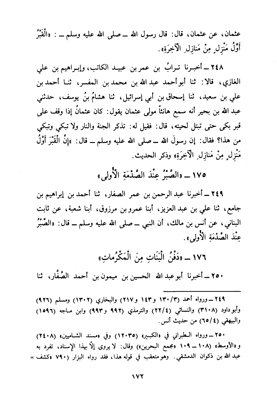 248 - أَخْبَرَنَا تُرَابُ بْنُ عُمَرَ بْنِ عُبَيْدٍ الْكَاتِبُ وَإِبْرَاهِيمُ بْنُ عَلِيٍّ الْغَازِي، قَالَا: ثنا أَبُو أَحْمَدَ عَبْدُ اللَّهِ بْنُ مُحَمَّدِ بْنِ الْمُفَسِّرِ، ثنا أَحْمَدُ بْنُ عَلِيِّ بْنِ سَعِيدٍ، ثنا إِسْحَاقُ بْنُ أَبِي إِسْرَائِيلَ، ثنا هِشَامُ بْنُ يُوسُفَ، حَدَّثَنِي عَبْدُ اللَّهِ بْنُ بَحِيرٍ، أَنَّهُ سَمِعَ هَانِئًا، مَوْلَى عُثْمَانَ يَقُولُ: كَانَ عُثْمَانُ إِذَا وَقَفَ عَلَى قَبْرٍ بَكَى حَتَّى تَبْتَلَّ لِحْيَتُهُ، قَالَ: فَقِيلَ لَهُ تُذْكَرُ الْجَنَّةُ وَالنَّارُ وَلَا تَبْكِي، وَتَبْكِي مِنْ هَذَا؟، فَقَالَ: إِنَّ رَسُولَ اللَّهِ صَلَّى اللهُ عَلَيْهِ وَسَلَّمَ قَالَ: §«إِنَّ الْقَبْرَ أَوَّلُ مَنْزِلٍ مِنْ مَنَازِلِ الْآخِرَةِ» وَذَكَرَ الْحَدِيثَ