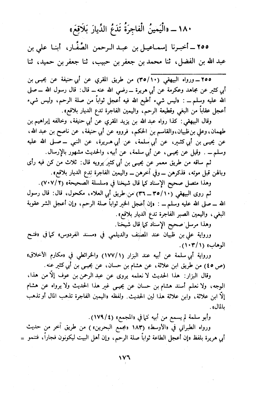 255 - أَخْبَرَنَا إِسْمَاعِيلُ بْنُ عَبْدِ الرَّحْمَنِ الصَّفَّارُ، أبنا عَلِيُّ بْنُ عَبْدِ اللَّهِ بْنِ الْفَضْلِ، ثنا مُحَمَّدُ بْنُ جَعْفَرِ بْنِ حَبِيبٍ، ثنا جَعْفَرُ بْنُ حُمَيْدٍ، ثنا عَلِيُّ بْنُ ظَبْيَانَ، عَنْ أَبِي حَنِيفَةَ، عَنْ نَاصِحِ بْنِ عَبْدِ اللَّهِ، عَنْ يَحْيَى بْنِ أَبِي كَثِيرٍ، عَنْ أَبِي سَلَمَةَ، عَنْ أَبِي هُرَيْرَةَ، قَالَ: قَالَ رَسُولُ اللَّهِ صَلَّى اللهُ عَلَيْهِ وَسَلَّمَ: §«الْيَمِينُ الْفَاجِرَةُ تَدَعُ الدِّيَارَ بَلَاقِعَ»