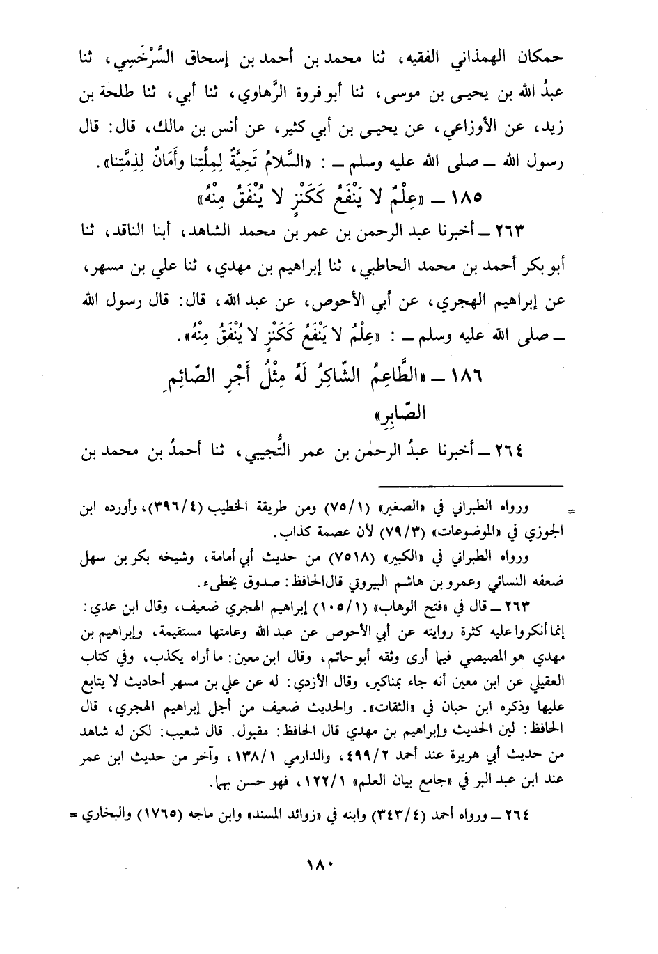 263 - أَخْبَرَنَا عَبْدُ الرَّحْمَنِ بْنُ عُمَرَ بْنِ مُحَمَّدٍ الشَّاهِدُ، أبنا النَّاقِدُ، ثنا أَبُو بَكْرٍ أَحْمَدُ بْنُ مُحَمَّدٍ الْحَاطِبِيُّ، ثنا إِبْرَاهِيمُ بْنُ مَهْدِيٍّ، ثنا عَلِيُّ بْنُ مُسْهِرٍ، عَنْ إِبْرَاهِيمَ الْهَجَرِيِّ، عَنْ أَبِي الْأَحْوَصِ، عَنْ عَبْدِ اللَّهِ، قَالَ: قَالَ رَسُولُ اللَّهِ صَلَّى اللهُ عَلَيْهِ وَسَلَّمَ: §«عِلْمٌ لَا يَنْفَعُ كَكَنْزٍ لَا يُنْفَقُ مِنْهُ»