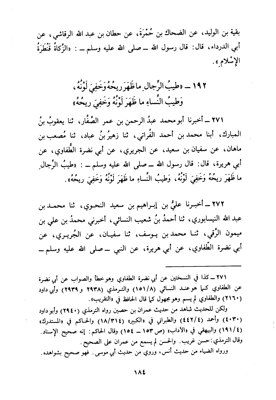 271 - أَخْبَرَنَا أَبُو مُحَمَّدٍ عَبْدُ الرَّحْمَنِ بْنُ عُمَرَ الصَّفَّارُ، ثنا يَعْقُوبُ بْنُ الْمُبَارَكِ، أبنا مُحَمَّدُ بْنُ أَحْمَدَ الْفُرَاتِيُّ، ثنا زُهَيْرُ بْنُ عَبَّادٍ، ثنا مُصْعَبُ بْنُ مَاهَانَ، عَنْ سُفْيَانَ بْنِ سَعِيدٍ، عَنِ الْجُرَيْرِيِّ، عَنْ أَبِي نَضْرَةَ , عَنْ الطُّفَاوِيِّ، عَنْ أَبِي هُرَيْرَةَ، قَالَ: قَالَ رَسُولُ اللَّهِ صَلَّى اللهُ عَلَيْهِ وَسَلَّمَ: «§طِيبُ الرِّجَالِ مَا ظَهَرَ رِيحُهُ وَخَفِيَ لَوْنُهُ، وَطِيبُ النِّسَاءِ مَا ظَهَرَ لَوْنُهُ وَخَفِيَ رِيحُهُ»