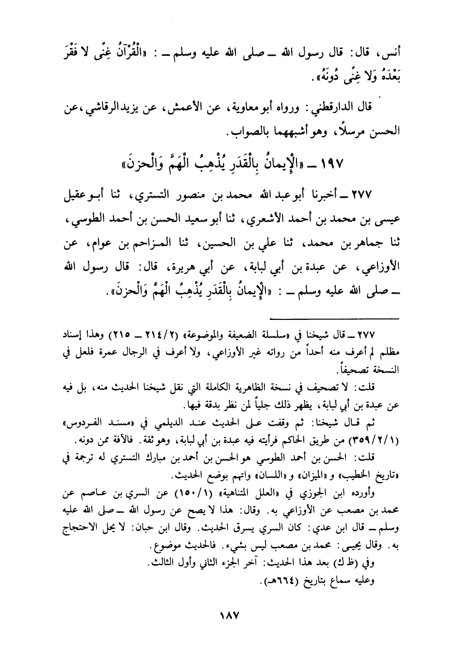 277 - أَخْبَرَنَا أَبُو عَبْدِ اللَّهِ مُحَمَّدُ بْنُ مَنْصُورٍ التُّسْتَرِيُّ، ثنا أَبُو عَقِيلٍ عِيسَى بْنُ مُحَمَّدِ بْنِ أَحْمَدَ الْأَشْعَرِيُّ، ثنا أَبُو سَعِيدٍ الْحَسَنُ بْنُ أَحْمَدَ الطُّوسِيُّ، ثنا جَمَاهِرُ بْنُ مُحَمَّدٍ، ثنا عَلِيُّ بْنُ الْحُسَيْنِ، ثنا الْمَزَاحِمُ بْنُ عَوَّامٍ، عَنِ الْأَوْزَاعِيِّ، عَنْ عَبْدَةَ بْنِ أَبِي لُبَابَةَ، عَنْ أَبِي هُرَيْرَةَ، قَالَ: قَالَ رَسُولُ اللَّهِ صَلَّى اللهُ عَلَيْهِ وَسَلَّمَ: §«الْإِيمَانُ بِالْقَدَرِ يُذْهِبُ الْهَمَّ وَالْحَزَنَ»