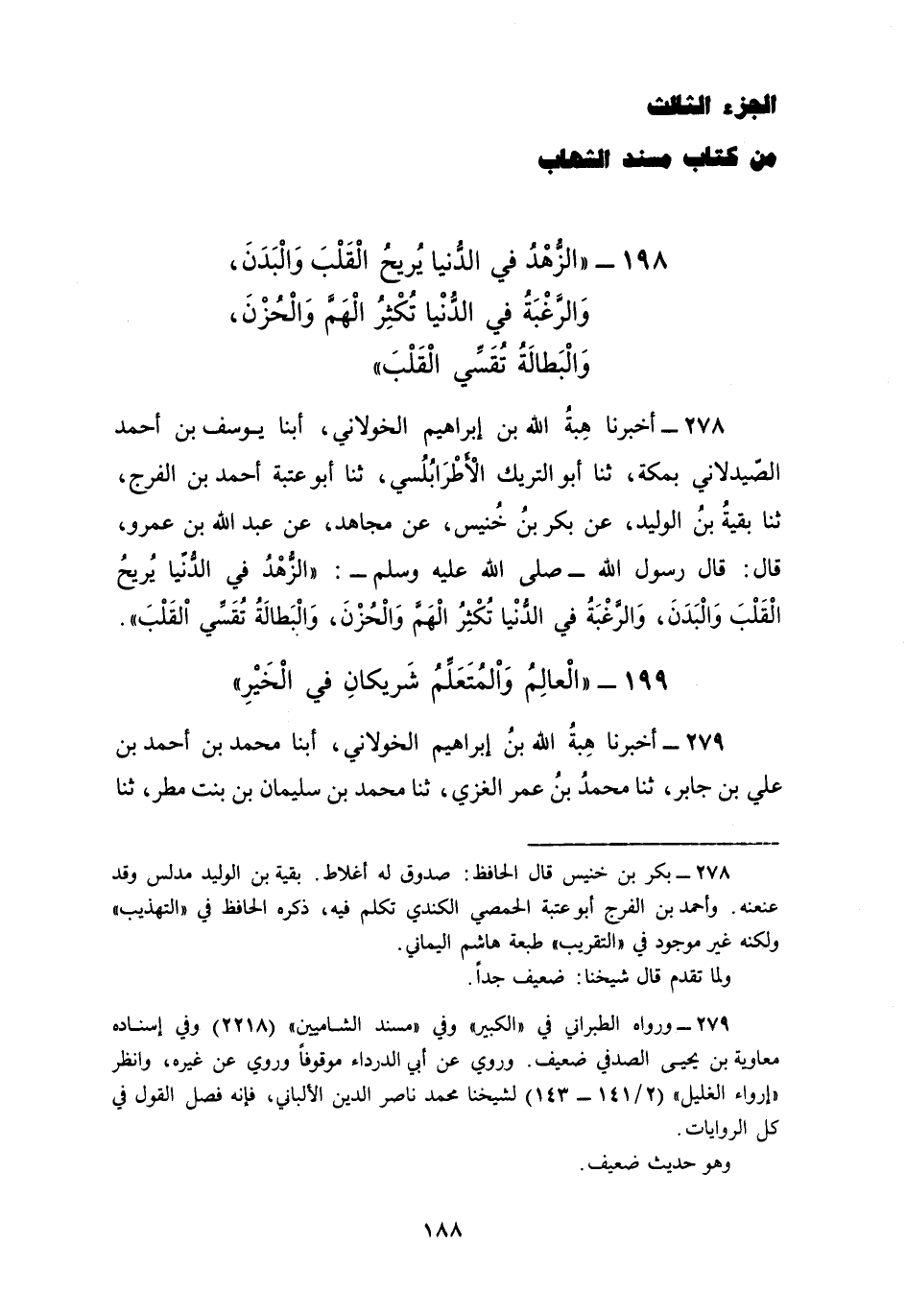 278 - أَخْبَرَنَا هِبَةُ اللَّهِ بْنُ إِبْرَاهِيمَ الْخَوْلَانِيُّ، أبنا يُوسُفُ بْنُ أَحْمَدَ الصَّيْدَلَانِيُّ بِمَكَّةَ، ثنا أَبُو التَّرِيكِ الْأَطَرْابُلْسِيُّ، ثنا أَبُو عُتْبَةَ أَحْمَدُ بْنُ الْفَرَجِ، ثنا بَقِيَّةُ بْنُ الْوَلِيدِ، عَنْ بَكْرِ بْنِ خُنَيْسٍ، عَنْ مُجَاهِدٍ، عَنْ عَبْدِ اللَّهِ بْنِ عَمْرٍو، قَالَ: قَالَ رَسُولُ اللَّهِ صَلَّى اللهُ عَلَيْهِ وَسَلَّمَ: «§الزُّهْدُ فِي الدُّنْيَا يَرِيحُ الْقَلْبَ وَالْبُدْنَ، وَالرَّغْبَةَ فِي الدُّنْيَا تُكْثِرُ الْهَمَّ وَالْحَزَنَ، وَالْبَطَالَةَ تُقْسِي الْقَلْبَ»