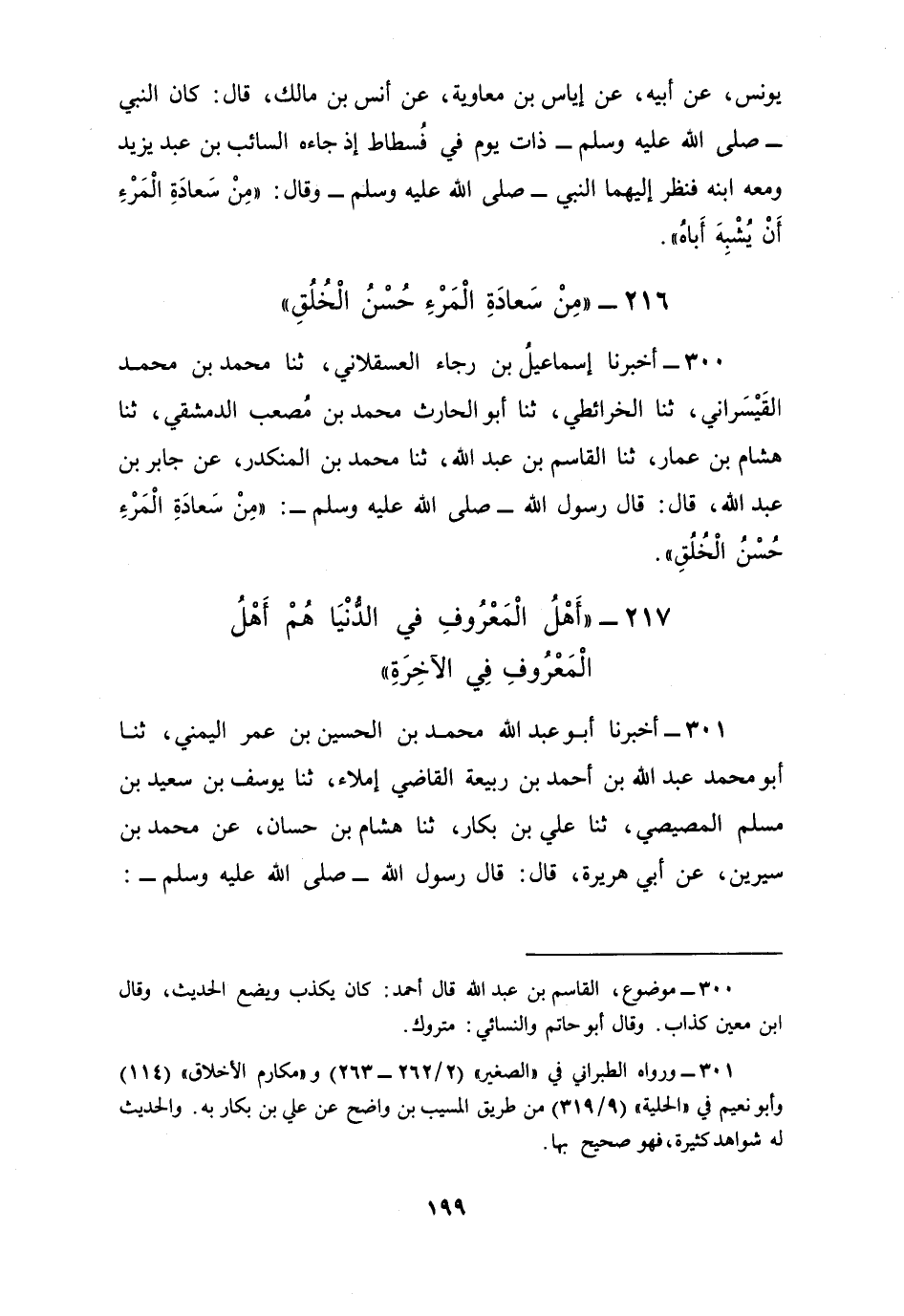 300 - أَخْبَرَنَا إِسْمَاعِيلُ بْنُ رَجَاءٍ الْعَسْقَلَانِيُّ، ثنا مُحَمَّدُ بْنُ مُحَمَّدٍ الْقَيْسَرَانِيُّ، ثنا الْخَرَائِطِيُّ، ثنا أَبُو الْحَارِثِ مُحَمَّدُ بْنُ مُصْعَبٍ الدِّمَشْقِيُّ، ثنا هِشَامُ بْنُ عَمَّارٍ، ثنا الْقَاسِمُ بْنُ عَبْدِ اللَّهِ، ثنا مُحَمَّدُ بْنُ الْمُنْكَدِرِ، عَنْ جَابِرِ بْنِ عَبْدِ اللَّهِ، قَالَ: قَالَ رَسُولُ اللَّهِ صَلَّى اللهُ عَلَيْهِ وَسَلَّمَ: §«مِنْ سَعَادَةِ الْمَرْءِ حُسْنِ الْخَلْقِ»
