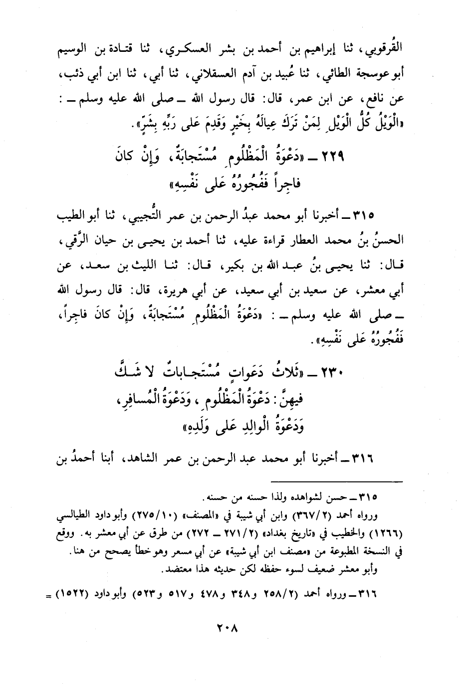 316 - أَخْبَرَنَا أَبُو مُحَمَّدٍ عَبْدُ الرَّحْمَنِ بْنُ عُمَرَ الشَّاهِدُ، أبنا أَحْمَدُ بْنُ إِبْرَاهِيمَ بْنِ جَامِعٍ، ثنا عَلِيُّ بْنُ عَبْدِ الْعَزِيزِ، ثنا مُسْلِمٌ، ثنا أَبَانُ بْنُ يَزِيدَ، عَنْ يَحْيَى، يَعْنِي ابْنَ أَبِي كَثِيرٍ، عَنْ أَبِي جَعْفَرٍ، عَنْ أَبِي هُرَيْرَةَ يَعْنِي: عَنِ النَّبِيِّ صَلَّى اللهُ عَلَيْهِ وَسَلَّمَ قَالَ: " §ثَلَاثُ دَعَوَاتٍ مُسْتَجَابَاتٌ لَا شَكُّ فِيهِنَّ: دَعْوَةُ الْمَظْلُومِ، وَدَعْوَةُ الْمُسَافِرِ، وَدَعْوَةُ الْوَالِدِ عَلَى وَلَدِهِ "