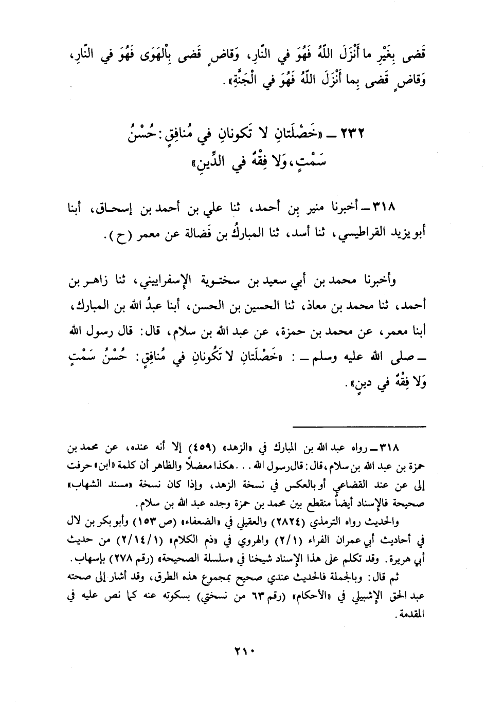 318 - أَخْبَرَنَا مُنِيرُ بْنُ أَحْمَدَ، ثنا عَلِيُّ بْنُ أَحْمَدَ بْنِ إِسْحَاقَ، أبنا أَبُو يَزِيدَ الْقَرَاطِيسِيُّ، ثنا أَسَدٌ، ثنا الْمُبَارَكُ بْنُ فَضَالَةَ، عَنْ مَعْمَرٍ، ح وَأَخْبَرَنَا مُحَمَّدُ بْنُ أَبِي سَعِيدِ بْنِ سَخْتَوَيْهِ الْإِسْفَرَايِينِيُّ، ثنا زَاهِرُ بْنُ أَحْمَدَ، ثنا مُحَمَّدُ بْنُ مُعَاذٍ، ثنا الْحُسَيْنُ بْنُ الْحَسَنِ، أبنا عَبْدُ اللَّهِ بْنُ الْمُبَارَكِ، أبنا مَعْمَرٌ، عَنْ مُحَمَّدِ بْنِ حَمْزَةَ، عَنْ عَبْدِ اللَّهِ بْنِ سَلَامٍ، قَالَ: قَالَ رَسُولُ اللَّهِ صَلَّى اللهُ عَلَيْهِ وَسَلَّمَ: §«خَصْلَتَانِ لَا تَكُونَانِ فِي مُنَافِقٍ حُسْنُ سَمْتٍ وَلَا فِقْهٌ فِي دَيْنٍ»