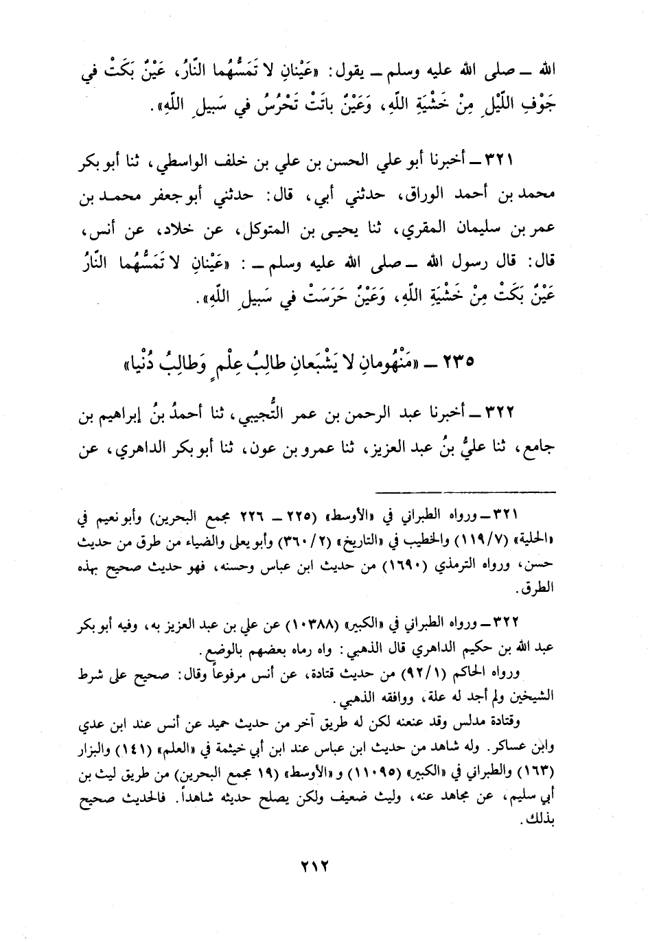321 - أَخْبَرَنَا أَبُو عَلِيٍّ الْحَسَنُ بْنُ عَلِيِّ بْنِ خَلَفٍ الْوَاسِطِيُّ، ثنا أَبُو بَكْرٍ مُحَمَّدُ بْنُ أَحْمَدَ الْوَرَّاقُ، حَدَّثَنِي أَبِي قَالَ: حَدَّثَنِي أَبُو جَعْفَرٍ مُحَمَّدُ بْنُ عُمَرَ بْنِ سُلَيْمَانَ الْمُقْرِئُ، ثنا يَحْيَى بْنُ الْمُتَوَكِّلِ، عَنْ خَلَّادٍ، عَنْ أَنَسٍ، قَالَ: قَالَ رَسُولُ اللَّهِ صَلَّى اللهُ عَلَيْهِ وَسَلَّمَ: " §عَيْنَانِ لَا تَمَسُّهُمَا النَّارُ: عَيْنٌ بَكَتْ مِنْ خَشْيَةِ اللَّهِ وَعَيْنٌ حَرَسَتْ فِي سَبِيلِ اللَّهِ "
