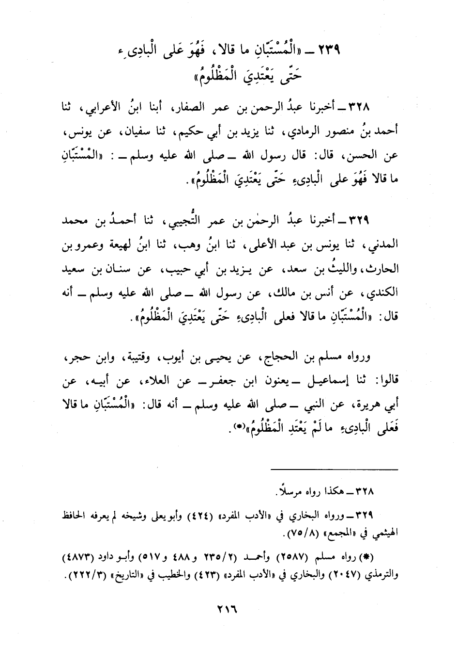 328 - أَخْبَرَنَا عَبْدُ الرَّحْمَنِ بْنُ عُمَرَ الصَّفَّارُ، أبنا ابْنُ الْأَعْرَابِيِّ، ثنا أَحْمَدُ بْنُ مَنْصُورٍ الرَّمَادِيُّ، ثنا يَزِيدُ بْنُ أَبِي حَكِيمٍ، ثنا سُفْيَانُ، عَنْ يُونُسَ، عَنِ الْحَسَنِ، قَالَ: قَالَ رَسُولُ اللَّهِ صَلَّى اللهُ عَلَيْهِ وَسَلَّمَ: «§الْمُسْتَبَّانِ مَا قَالَا، فَهُوَ عَلَى الْبَادِئِ حَتَّى يَعْتَدِيَ الْمَظْلُومُ»
