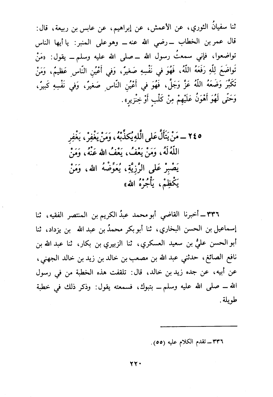 336 - أَخْبَرَنَا الْقَاضِي أَبُو مُحَمَّدٍ عَبْدُ الْكَرِيمِ بْنُ الْمُنْتَصِرِ الْفَقِيهُ، ثنا إِسْمَاعِيلُ بْنُ الْحَسَنِ الْبُخَارِيُّ، ثنا أَبُو بَكْرٍ مُحَمَّدُ بْنُ عَبْدِ اللَّهِ بْنِ يَزْدَادَ، ثنا أَبُو الْحَسَنِ عَلِيُّ بْنُ سَعِيدٍ الْعَسْكَرِيُّ، ثنا الزُّبَيْرِيُّ بْنُ بَكَّارٍ، ثنا عَبْدُ اللَّهِ بْنُ نَافِعٍ الصَّائِغُ، حَدَّثَنِي عَبْدُ اللَّهِ بْنُ مُصْعَبِ بْنِ خَالِدِ بْنِ زَيْدِ بْنِ خَالِدٍ الْجُهَنِيُّ، عَنْ أَبِيهِ، عَنْ جَدِّهِ زَيْدِ بْنِ خَالِدٍ قَالَ: تَلَقَّفْتُ هَذِهِ الْخُطْبَةَ مِنْ فِي رَسُولِ اللَّهِ صَلَّى اللهُ عَلَيْهِ وَسَلَّمَ بِتَبُوكَ فَسَمِعْتُهُ يَقُولُ، وَذَكَرَ ذَلِكَ فِي خُطْبَةٍ طَوِيلَةٍ