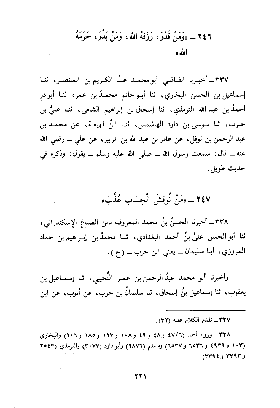 338 - أَخْبَرَنَا الْحَسَنُ بْنُ مُحَمَّدٍ الْمَعْرُوفُ بِابْنِ الصَّبَّاغِ الْإِسْكَنْدَرَانِيُّ، ثنا أَبُو الْحَسَنِ عَلِيُّ بْنُ أَحْمَدَ الْبَغْدَادِيُّ، ثنا مُحَمَّدُ بْنُ إِبْرَاهِيمَ بْنِ حَمَّادٍ الْمَرْوَزِيُّ، أبنا سُلَيْمَانُ يَعْنِي ابْنَ حَرْبٍ، ح وَأَخْبَرَنَا أَبُو مُحَمَّدٍ عَبْدُ الرَّحْمَنِ بْنُ عُمَرَ التُّجِيبِيُّ، ثنا إِسْمَاعِيلُ بْنُ يَعْقُوبَ، ثنا إِسْمَاعِيلُ بْنُ إِسْحَاقَ، ثنا سُلَيْمَانُ بْنُ حَرْبٍ، عَنْ أَيُّوبَ، عَنِ ابْنِ أَبِي مُلَيْكَةَ، عَنْ عَائِشَةَ، قَالَتْ: قَالَ رَسُولُ اللَّهِ صَلَّى اللهُ عَلَيْهِ وَسَلَّمَ: §«مِنْ نُوقِشَ الْحِسَابَ عُذِّبَ»