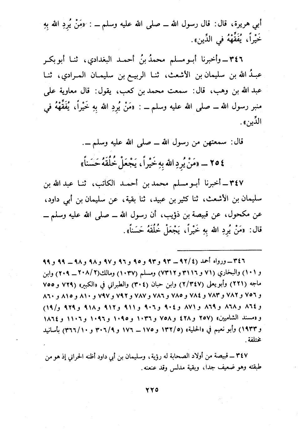 346 - وَأَخْبَرَنَا أَبُو مُسْلِمٍ مُحَمَّدُ بْنُ أَحْمَدَ الْبَغْدَادِيُّ، ثنا أَبُو بَكْرٍ عَبْدُ اللَّهِ بْنُ سُلَيْمَانَ بْنِ الْأَشْعَثَ، ثنا الرَّبِيعُ بْنُ سُلَيْمَانَ الْمُرَادِيُّ، ثنا عَبْدُ اللَّهِ بْنُ وَهْبٍ، قَالَ: سَمِعْتُ مُحَمَّدَ بْنَ كَعْبٍ، يَقُولُ: قَالَ مُعَاوِيَةُ عَلَى مِنْبَرِ رَسُولِ اللَّهِ صَلَّى اللهُ عَلَيْهِ وَسَلَّمَ: §«مَنْ يُرِدِ اللَّهُ بِهِ خَيْرًا يُفَقِّهْهُ فِي الدِّينِ» قَالَ: سَمِعْتُهُنَّ مِنْ رَسُولِ اللَّهِ صَلَّى اللهُ عَلَيْهِ وَسَلَّمَ