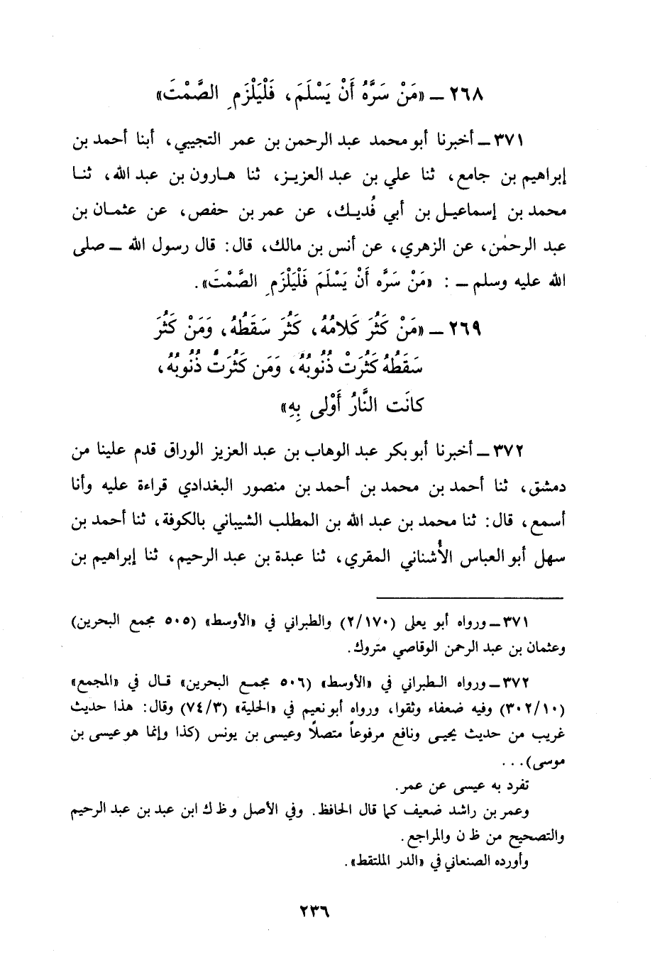 371 - أَخْبَرَنَا أَبُو مُحَمَّدٍ عَبْدُ الرَّحْمَنِ بْنُ عُمَرَ التُّجِيبِيُّ، أبنا أَحْمَدُ بْنُ إِبْرَاهِيمَ بْنِ جَامِعٍ، ثنا عَلِيُّ بْنُ عَبْدِ الْعَزِيزِ، ثنا هَارُونُ بْنُ عَبْدِ اللَّهِ، ثنا مُحَمَّدُ بْنُ إِسْمَاعِيلَ بْنِ أَبِي فُدَيْكٍ، عَنْ عُمَرَ بْنِ حَفْصٍ، عَنْ عُثْمَانَ بْنِ عَبْدِ الرَّحْمَنِ، عَنِ الزُّهْرِيِّ , عَنْ أَنَسِ بْنِ مَالِكٍ، قَالَ: قَالَ رَسُولُ اللَّهِ صَلَّى اللهُ عَلَيْهِ وَسَلَّمَ: §«مَنْ سَرَّهُ أَنْ يَسْلَمَ فَلْيَلْزَمِ الصَّمْتَ»