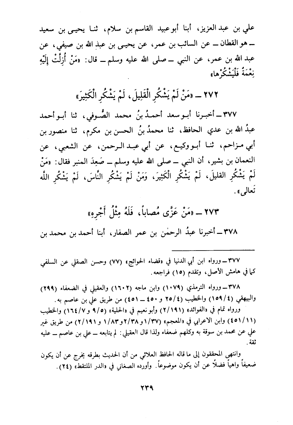 377 - أَخْبَرَنَا أَبُو سَعْدٍ أَحْمَدُ بْنُ مُحَمَّدٍ الصُّوفِيُّ ثنا أَبُو أَحْمَدَ عَبْدُ اللَّهِ بْنُ عَدِيٍّ الْحَافِظُ، ثنا مُحَمَّدُ بْنُ الْحُسَيْنِ بْنِ مُكْرَمٍ، ثنا مَنْصُورُ بْنُ أَبِي مُزَاحِمٍ، ثنا أَبُو وَكِيعٍ، عَنْ أَبِي عَبْدِ الرَّحْمَنِ، عَنِ الشَّعْبِيِّ، عَنِ النُّعْمَانِ بْنِ بَشِيرٍ، أَنَّ النَّبِيَّ صَلَّى اللهُ عَلَيْهِ وَسَلَّمَ صَعِدَ الْمِنْبَرَ فَقَالَ: «§مَنْ لَمْ يَشْكُرِ الْقَلِيلَ لَمْ يَشْكُرِ الْكَثِيرَ، وَمَنْ لَمْ يَشْكُرِ النَّاسَ لَمْ يَشْكُرِ اللَّهَ تَعَالَى»