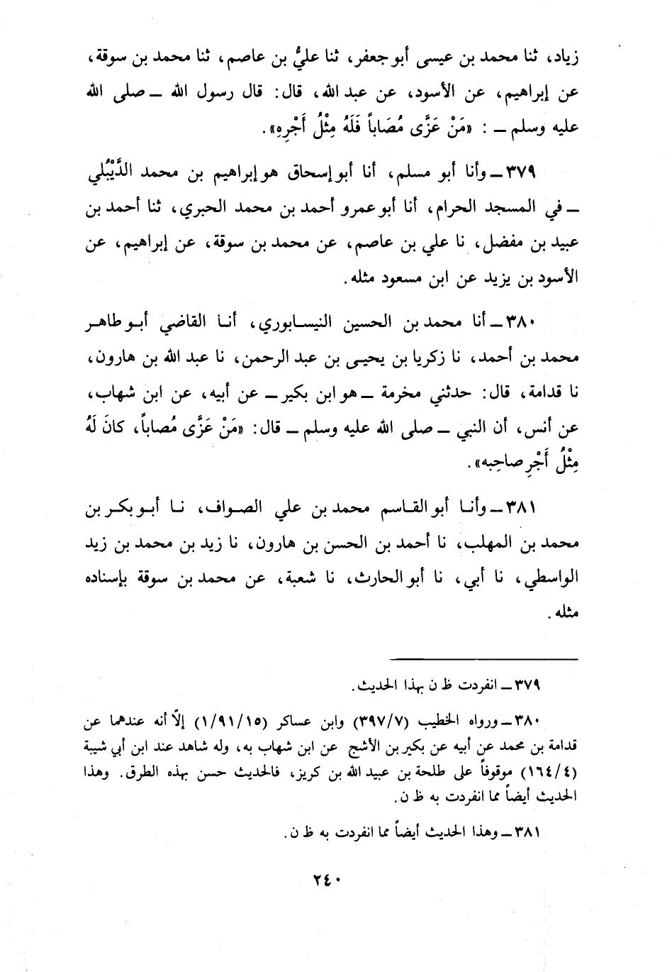 380 - أنا مُحَمَّدُ بْنُ الْحُسَيْنِ النَّيْسَابُورِيُّ، أنا الْقَاضِي أَبُو طَاهِرٍ، مُحَمَّدُ بْنُ أَحْمَدَ نا زَكَرِيَّا بْنُ يَحْيَى بْنِ عَبْدِ الرَّحْمَنِ، نا عَبْدُ اللَّهِ بْنُ هَارُونَ، نا قُدَامَةُ، قَالَ: حَدَّثَنِي مَخْرَمَةُ هُوَ ابْنُ بُكَيْرٍ عَنْ أَبِيهِ، عَنِ ابْنِ شِهَابٍ , عَنْ أَنَسٍ، أَنَّ النَّبِيَّ صَلَّى اللهُ عَلَيْهِ وَسَلَّمَ قَالَ: §«مَنْ عَزَّى مُصَابًا كَانَ لَهُ مِثْلُ أَجْرِ صَاحِبِهِ»