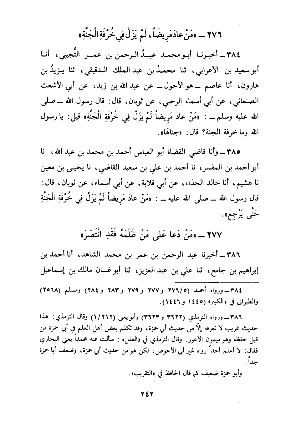 385 - وأنا قَاضِي الْقُضَاةِ أَبُو الْعَبَّاسِ أَحْمَدُ بْنُ مُحَمَّدِ بْنِ عَبْدِ اللَّهِ، نا أَبُو أَحْمَدَ بْنُ الْمُفَسِّرِ، نا أَحْمَدُ بْنُ عَلِيِّ بْنِ سَعِيدٍ الْقَاضِي، نا يَحْيَى بْنُ مَعِينٍ، نا هُشَيْمٌ، أنا خَالِدٌ الْحَذَّاءُ، عَنْ أَبِي قِلَابَةَ، عَنْ أَبِي أَسْمَاءَ , عَنْ ثَوْبَانَ، قَالَ: قَالَ رَسُولُ اللَّهِ صَلَّى اللهُ عَلَيْهِ وَسَلَّمَ: §«مَنْ عَادَ مَرِيضًا لَمْ يَزَلْ فِي خُرْفَةِ الْجَنَّةِ حَتَّى يَرْجِعَ»