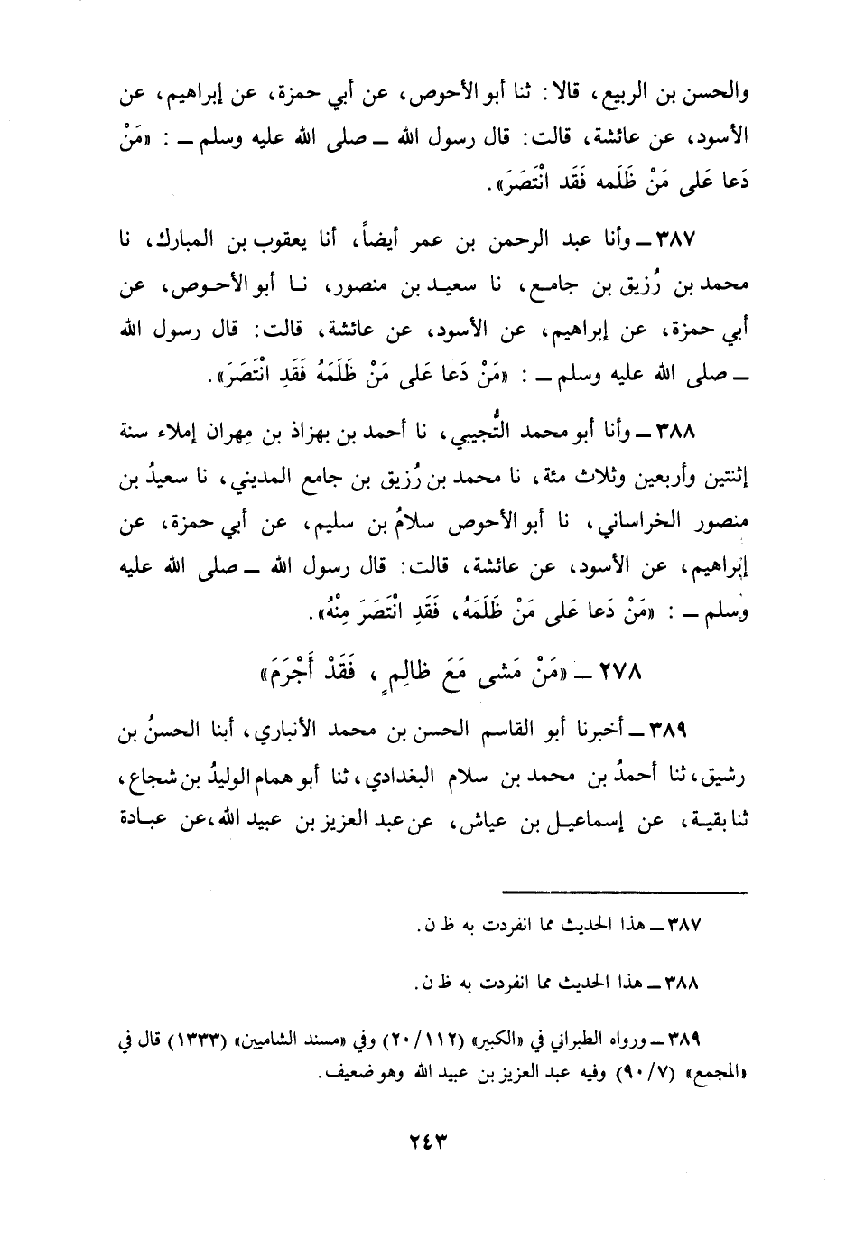 388 - وأنا أَبُو مُحَمَّدٍ التُّجِيبِيُّ، نا أَحْمَدُ بْنُ بُهْزَاذَ بْنِ مِهْرَانَ، إِمْلَاءً، سَنَةَ اثْنَتَيْنِ وَأَرْبَعِينَ وَثَلَاثِ مِائَةٍ، نا مُحَمَّدُ بْنُ رُزَيْقِ بْنِ جَامِعٍ الْمَدِينِيُّ، نا سَعِيدُ بْنُ مَنْصُورٍ الْخُرَاسَانِيُّ، نا أَبُو الْأَحْوَصِ سَلَّامُ بْنُ سُلَيْمٍ، عَنْ أَبِي حَمْزَةَ، عَنْ إِبْرَاهِيمَ عَنِ الْأَسْوَدِ عَنْ عَائِشَةَ قَالَتْ: قَالَ رَسُولُ اللَّهِ صَلَّى اللهُ عَلَيْهِ وَسَلَّمَ: §«مَنْ دَعَا عَلَى مَنْ ظَلَمَهُ فَقَدِ انْتَصَرَ مِنْهُ»