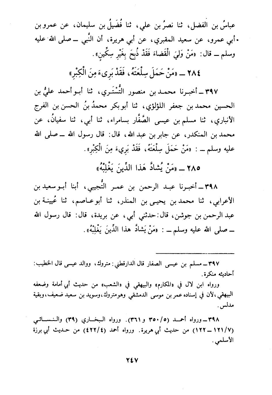 397 - أَخْبَرَنَا مُحَمَّدُ بْنُ مَنْصُورٍ التُّسْتَرِيُّ، ثنا أَبُو أَحْمَدَ عَلِيُّ بْنُ الْحُسَيْنِ مُحَمَّدِ بْنِ جَعْفَرٍ اللُّؤْلُؤِيُّ، ثنا أَبُو بَكْرٍ مُحَمَّدُ بْنُ الْحَسَنِ بْنِ الْفَرَجِ الْأَنْبَارِيُّ، ثنا مُسْلِمُ بْنُ عِيسَى الصَّفَّارُ، بِسَامَرَّاءَ، ثنا أَبِي، ثنا سُفْيَانُ، عَنْ مُحَمَّدِ بْنِ الْمُنْكَدِرِ , عَنْ جَابِرِ بْنِ عَبْدِ اللَّهِ، قَالَ: قَالَ رَسُولُ اللَّهِ صَلَّى اللهُ عَلَيْهِ وَسَلَّمَ: §«مَنْ حَمَلَ سِلْعَتَهُ فَقَدْ بَرِئَ مِنَ الْكِبْرِ»