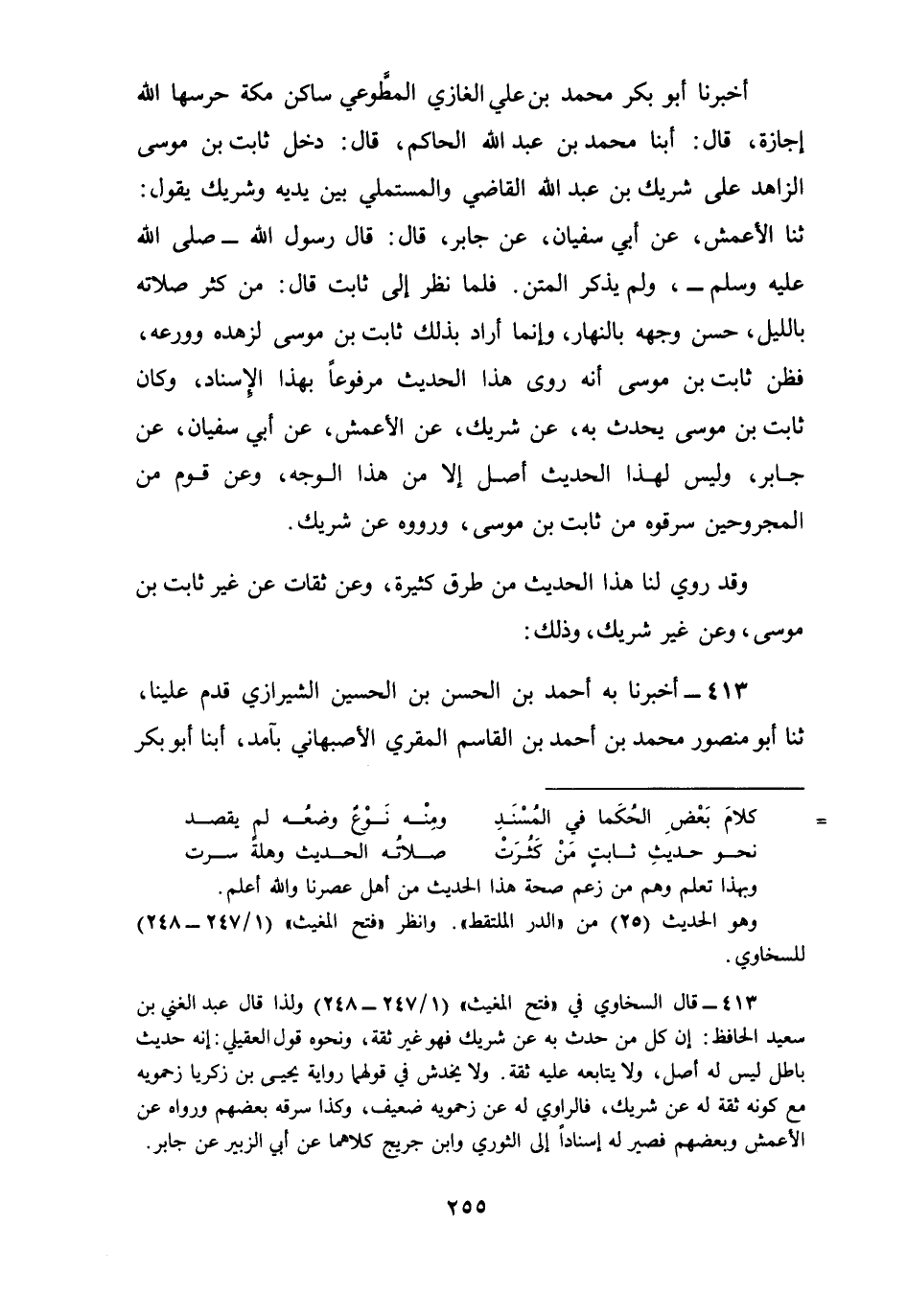 413 - أَخْبَرَنَا بِهِ أَحْمَدُ بْنُ الْحَسَنِ بْنِ الْحُسَيْنِ الشِّيرَازِيُّ قَدِمَ عَلَيْنَا، ثنا أَبُو مَنْصُورٍ، مُحَمَّدُ بْنُ أَحْمَدَ بْنِ الْقَاسِمِ الْمُقْرِئُ الْأَصْبَهَانِيُّ بِآمِدَ، أبنا أَبُو بَكْرٍ مُحَمَّدُ بْنُ عَدِيِّ بْنِ عَلِيِّ بْنِ زَهْرٍ الْمِنْقَرِيُّ الدَّقِيقِيُّ بِالْبَصْرَةِ، ثنا الْقَاضِي أَحْمَدُ بْنُ مُوسَى بْنِ إِسْحَاقَ بْنِ الْقَاسِمِ بْنِ الْخَضِرِ بْنِ نَصْرٍ الْمُخَرِّمِيُّ، ثنا إِسْحَاقُ بْنُ إِبْرَاهِيمَ وَأَحْمَدُ بْنُ عَلِيٍّ النَّجَّارُ وَمُحَمَّدُ بْنُ عَلِيِّ بْنِ الرَّبِيعِ وَابْنُ عَبْدِ السَّلَامِ، قَالُوا: ثنا عَبْدُ الرَّزَّاقِ، عَنْ سُفْيَانَ الثَّوْرِيِّ وَابْنِ جُرَيْجٍ، عَنْ أَبِي الزُّبَيْرِ , عَنْ جَابِرِ بْنِ عَبْدِ اللَّهِ، قَالَ: قَالَ رَسُولُ اللَّهِ صَلَّى اللهُ عَلَيْهِ وَسَلَّمَ: §«مَنْ كَثُرَ صَلَاتُهُ بِاللَّيْلِ حَسُنَ وَجْهُهُ بِالنَّهَارِ»