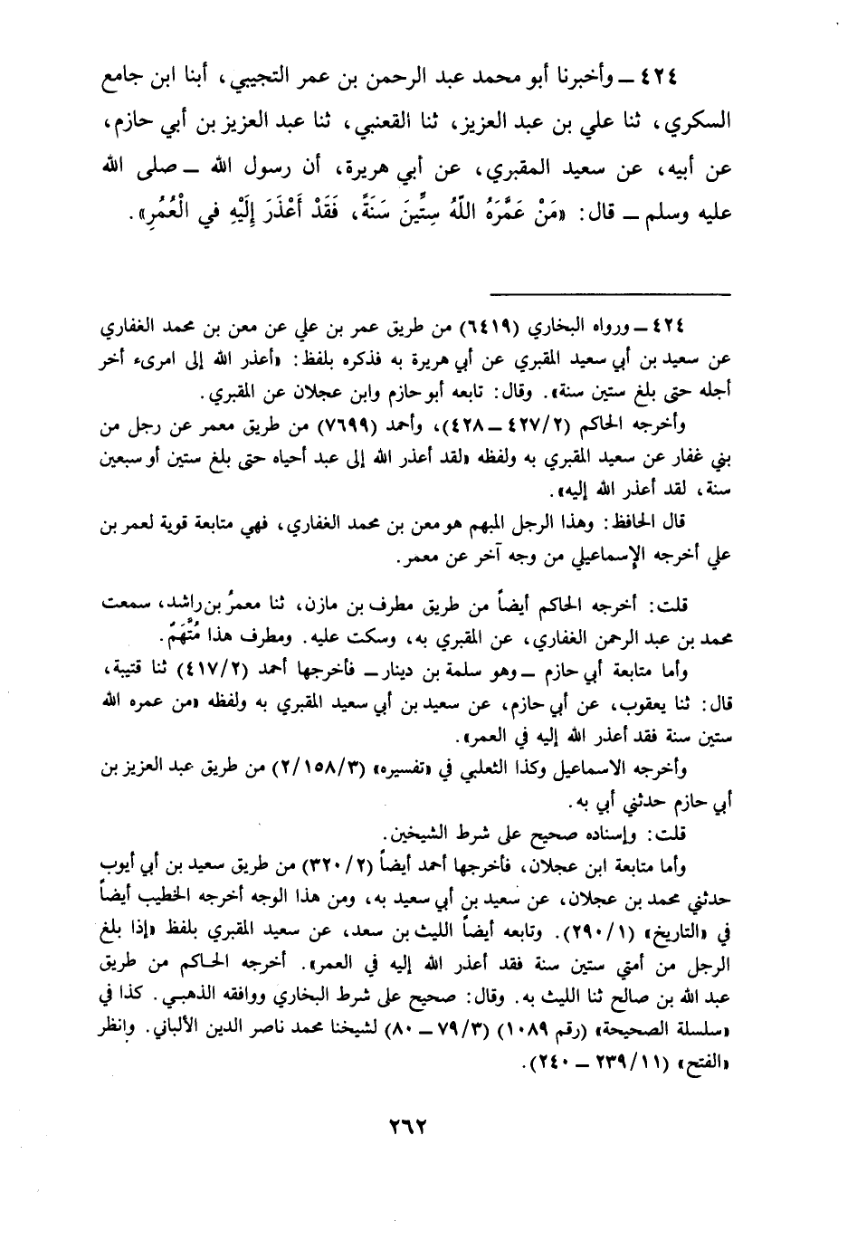 424 - وَأَخْبَرَنَا أَبُو مُحَمَّدٍ عَبْدُ الرَّحْمَنِ بْنُ عُمَرَ التُّجِيبِيُّ، أبنا ابْنُ جَامِعٍ السُّكَّرِيُّ، ثنا عَلِيُّ بْنُ عَبْدِ الْعَزِيزِ، ثنا الْقَعْنَبِيُّ، ثنا عَبْدُ الْعَزِيزِ بْنُ أَبِي حَازِمٍ، عَنْ أَبِيهِ، عَنْ سَعِيدٍ الْمَقْبُرِيِّ , عَنْ أَبِي هُرَيْرَةَ، أَنَّ رَسُولَ اللَّهِ صَلَّى اللهُ عَلَيْهِ وَسَلَّمَ قَالَ: §«مَنْ عَمَّرَهُ اللَّهُ سِتِّينَ سَنَةً فَقَدْ أَعْذَرَ إِلَيْهِ فِي الْعُمُرِ»