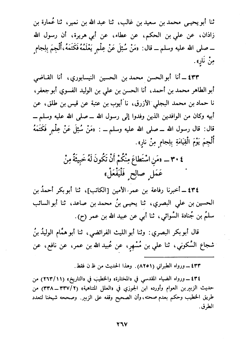 433 - أنا أَبُو الْحَسَنِ، مُحَمَّدُ بْنُ الْحُسَيْنِ النَّيْسَابُورِيُّ أنا الْقَاضِي أَبُو الطَّاهِرِ، مُحَمَّدُ بْنُ أَحْمَدَ أنا الْحَسَنُ بْنُ عَلِيِّ بْنِ الْوَلِيدِ الْفَسَوِيُّ أَبُو جَعْفَرٍ، نا حَمَّادُ بْنُ مُحَمَّدٍ الْبَجَلِيُّ الْأَزْرَقُ، نا أَيُّوبُ بْنُ عُتْبَةَ، عَنْ قَيْسِ بْنِ طَلْقٍ، عَنْ أَبِيهِ، وَكَانَ مِنَ الْوَافِدِينَ الَّذِينَ وَفَدُوا إِلَى رَسُولِ اللَّهِ صَلَّى اللهُ عَلَيْهِ وَسَلَّمَ قَالَ: قَالَ رَسُولُ اللَّهِ صَلَّى اللهُ عَلَيْهِ وَسَلَّمَ: §«مَنْ سُئِلَ عَنْ عِلْمٍ فَكَتَمَهُ أُلْجِمَ يَوْمَ الْقِيَامَةِ بِلِجَامٍ مِنْ نَارٍ»