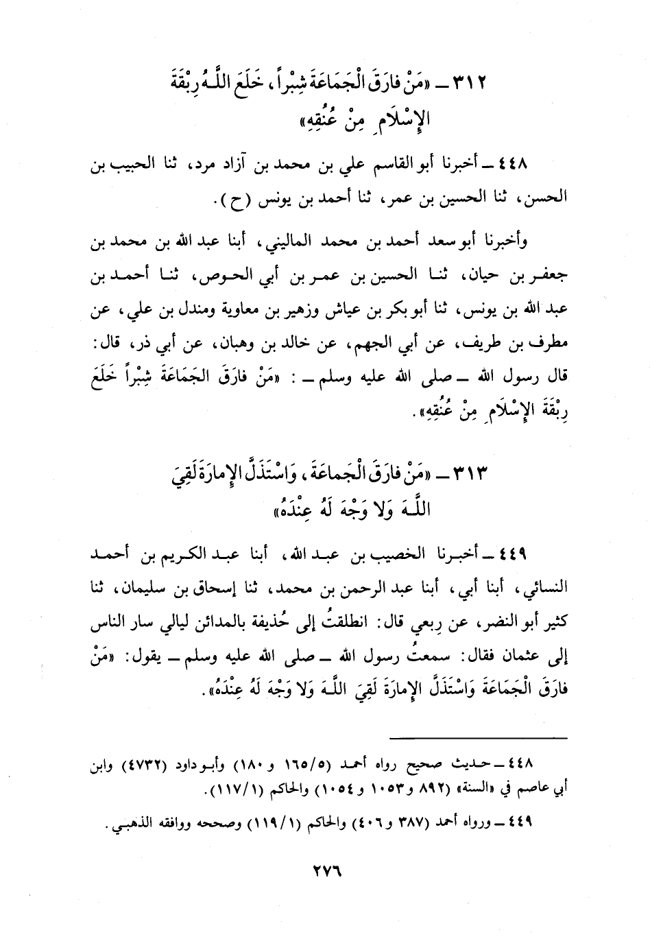 448 - أَخْبَرَنَا أَبُو الْقَاسِمِ عَلِيُّ بْنُ مُحَمَّدِ بْنِ أَزَادَ مُرْدَ ثنا الْحَبِيبُ بْنُ الْحَسَنِ، ثنا الْحُسَيْنُ بْنُ عُمَرَ، ثنا أَحْمَدُ بْنُ يُونُسَ، ح وَأَخْبَرَنَا أَبُو سَعْدٍ أَحْمَدُ بْنُ مُحَمَّدٍ الْمَالِينِيُّ، أبنا عَبْدُ اللَّهِ بْنُ مُحَمَّدِ بْنِ جَعْفَرِ بْنِ حَيَّانَ، ثنا الْحُسَيْنُ بْنُ عُمَرَ بْنِ أَبِي الْأَحْوَصِ، ثنا أَحْمَدُ بْنُ عَبْدِ اللَّهِ بْنِ يُونُسَ، ثنا أَبُو بَكْرِ بْنُ عَيَّاشٍ، وَزُهَيْرُ بْنُ مُعَاوِيَةَ، وَمَنْدَلُ بْنُ عَلِيٍّ، عَنْ مُطَرِّفِ بْنِ طَرِيفٍ، عَنْ أَبِي الْجَهْمِ، عَنْ خَالِدِ بْنِ وَهْبَانَ , عَنْ أَبِي ذَرٍّ، قَالَ: قَالَ رَسُولُ اللَّهِ صَلَّى اللهُ عَلَيْهِ وَسَلَّمَ: §«مَنْ فَارَقَ الْجَمَاعَةَ شِبْرًا خَلَعَ رِبْقَةَ الْإِسْلَامِ مِنْ عُنُقِهِ»