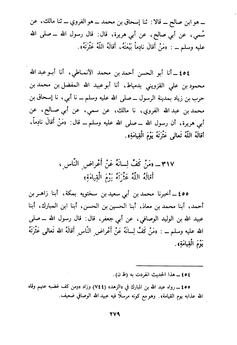 454 - أنا أَبُو الْحَسَنِ أَحْمَدُ بْنُ مُحَمَّدٍ الْأَنْمَاطِيُّ أنا أَبُو عَبْدِ اللَّهِ مَحْمُودُ بْنُ عَلِيٍّ الْقَزْوِينِيُّ بِدِمْيَاطَ أنا أَبُو عُبَيْدِ اللَّهِ الْمُفَضَّلُ بْنُ مُحَمَّدِ بْنِ حَرْبِ بْنِ زِيَادٍ بِمَدِينَةِ الرَّسُولِ صَلَّى اللهُ عَلَيْهِ وَسَلَّمَ، نا أَبِي، نا إِسْحَاقُ بْنُ مُحَمَّدِ بْنِ عَبْدِ اللَّهِ الْفَرْوِيُّ، نا مَالِكٌ، عَنْ سُمَيٍّ، عَنْ أَبِي صَالِحٍ، عَنْ أَبِي هُرَيْرَةَ أَنَّ رَسُولَ اللَّهِ صَلَّى اللهُ عَلَيْهِ وَسَلَّمَ قَالَ: §«مَنْ أَقَالَ نَادِمًا أَقَالَهُ اللَّهُ تَعَالَى عَثْرَتَهُ يَوْمَ الْقِيَامَةِ»