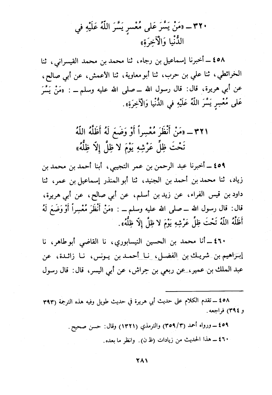 458 - أَخْبَرَنَا إِسْمَاعِيلُ بْنُ رَجَاءٍ، ثنا مُحَمَّدُ بْنُ مُحَمَّدٍ الْقَيْسَرَانِيُّ، ثنا الْخَرَائِطِيُّ، ثنا عَلِيُّ بْنُ حَرْبٍ، ثنا أَبُو مُعَاوِيَةَ، ثنا الْأَعْمَشُ، عَنْ أَبِي صَالِحٍ , عَنْ أَبِي هُرَيْرَةَ، قَالَ: قَالَ رَسُولُ اللَّهِ صَلَّى اللهُ عَلَيْهِ وَسَلَّمَ: §«مَنْ يَسَّرَ عَلَى مُعْسِرٍ يَسَّرَ اللَّهُ عَلَيْهِ فِي الدُّنْيَا وَالْآخِرَةِ»