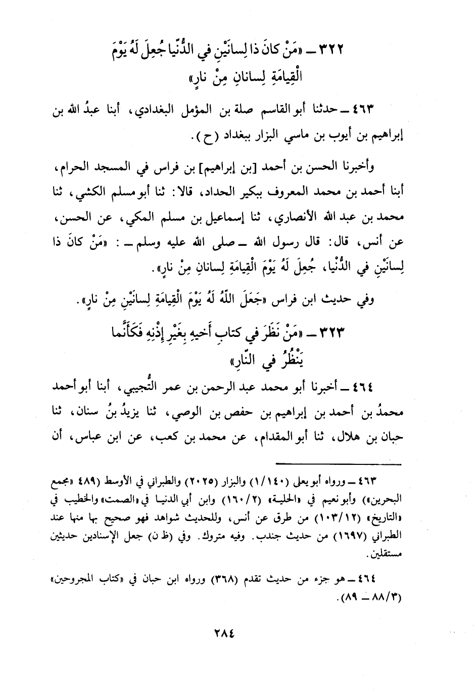 463 - حَدَّثَنَا أَبُو الْقَاسِمِ صِلَةُ بْنُ الْمُؤَمَّلِ الْبَغْدَادِيُّ أبنا عَبْدُ اللَّهِ بْنُ إِبْرَاهِيمَ بْنِ أَيُّوبَ بْنِ مَاسِيٍّ الْبَزَّارُ بِبَغْدَادَ، ح وَأَخْبَرَنَا الْحَسَنُ بْنُ أَحْمَدَ بْنِ إِبْرَاهِيمَ بْنِ فِرَاسٍ، فِي الْمَسْجِدِ الْحَرَامِ، أبنا أَحْمَدُ بْنُ مُحَمَّدٍ الْمَعْرُوفُ بِبُكَيْرٍ الْحَدَّادُ قَالَا: ثنا أَبُو مُسْلِمٍ الْكَشِّيُّ، ثنا مُحَمَّدُ بْنُ عَبْدِ اللَّهِ الْأَنْصَارِيُّ، ثنا إِسْمَاعِيلُ بْنُ مُسْلِمٍ الْمَكِّيُّ، عَنِ الْحَسَنِ، عَنْ أَنَسٍ، قَالَ: قَالَ رَسُولُ اللَّهِ صَلَّى اللهُ عَلَيْهِ وَسَلَّمَ: §«مَنْ كَانَ ذَا لِسَانَيْنِ فِي الدُّنْيَا جُعِلَ لَهُ يَوْمَ الْقِيَامَةِ لِسَانَانِ مِنْ نَارٍ» وَفِي حَدِيثِ ابْنِ فِرَاسٍ: «جَعَلَ اللَّهُ لَهُ يَوْمَ الْقِيَامَةِ لِسَانَيْنِ مِنْ نَارٍ»