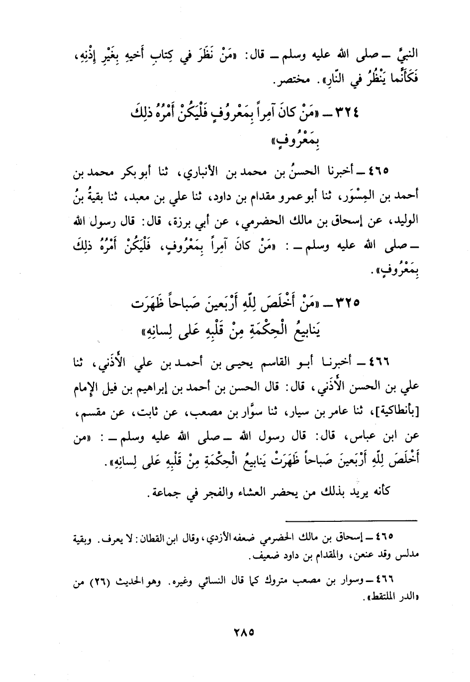 466 - أَخْبَرَنَا أَبُو الْقَاسِمِ يَحْيَى بْنُ أَحْمَدَ بْنِ عَلِيٍّ الْأَذَنِيُّ ثنا عَلِيُّ بْنُ الْحُسَيْنِ الْأَذَنِيُّ، قَالَ: قَالَ الْحَسَنُ بْنُ أَحْمَدَ بْنِ إِبْرَاهِيمَ بْنِ فِيلٍ الْإِمَامُ بِأَنْطَاكِيَةَ، ثنا عَامِرُ بْنُ سَيَّارٍ، ثنا سَوَّارُ بْنُ مُصْعَبٍ، عَنْ ثَابِتٍ، عَنْ مِقْسَمٍ، عَنِ ابْنِ عَبَّاسٍ، قَالَ: قَالَ رَسُولُ اللَّهِ صَلَّى اللهُ عَلَيْهِ وَسَلَّمَ: §«مَنْ أَخْلَصَ لِلَّهِ أَرْبَعِينَ صَبَاحًا ظَهَرَتْ يَنَابِيعُ الْحِكْمَةِ مِنْ قَلْبِهِ عَلَى لِسَانِهِ» كَأَنَّهُ يُرِيدُ بِذَلِكَ: مَنْ يَحْضُرُ الْعِشَاءَ وَالْفَجْرَ فِي جَمَاعَةٍ، وَمَنْ حَضَرَهُمَا أَرْبَعِينَ يَوْمًا يُدْرِكُ التَّكْبِيرَةَ الْأُولَى كُتِبَ لَهُ بَرَاءَتَانِ بَرَاءَةٌ مِنَ النَّارِ، وَبَرَاءَةٌ مِنَ النِّفَاقِ