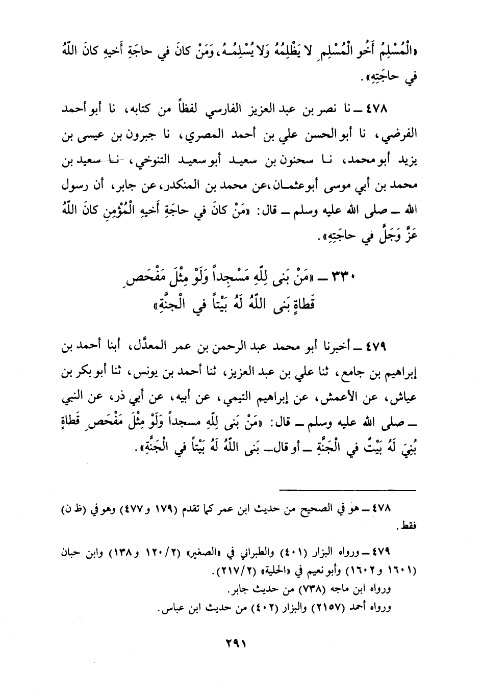 478 - نا نَصْرُ بْنُ عَبْدِ الْعَزِيزِ الْفَارِسِيُّ، لَفْظًا مِنْ كِتَابِهِ، نا أَبُو أَحْمَدَ الْفَرْضِيُّ، نا أَبُو الْحَسَنِ عَلِيُّ بْنُ أَحْمَدَ الْمِصْرِيُّ، نا جَبْرُونُ بْنُ عِيسَى بْنِ يَزِيدَ أَبُو مُحَمَّدٍ، نا سَحْنُونُ بْنُ سَعِيدٍ أَبُو سَعِيدٍ التَّنُوخِيُّ، نا سَعِيدُ بْنُ مُحَمَّدِ بْنِ أَبِي مُوسَى أَبُو عُثْمَانَ، عَنْ مُحَمَّدِ بْنِ الْمُنْكَدِرِ، عَنْ جَابِرٍ، أَنَّ رَسُولَ اللَّهِ صَلَّى اللهُ عَلَيْهِ وَسَلَّمَ قَالَ: §«مَنْ كَانَ فِي حَاجَةِ أَخِيهِ الْمُؤْمِنِ كَانَ اللَّهُ عَزَّ وَجَلَّ فِي حَاجَتِهِ»