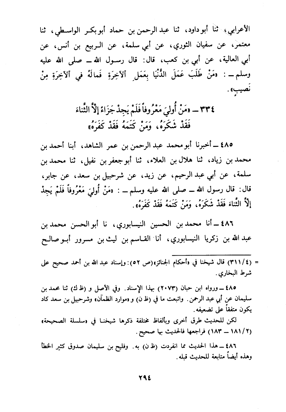 486 - أنا مُحَمَّدُ بْنُ الْحُسَيْنِ النَّيْسَابُورِيُّ، نا أَبُو الْحَسَنِ، مُحَمَّدُ بْنُ عَبْدِ اللَّهِ بْنِ زَكَرِيَّا النَّيْسَابُورِيُّ أنا الْقَاسِمُ بْنُ لَيْثِ بْنِ مَسْرُورٍ أَبُو صَالِحٍ الرَّاسِبِيُّ، نا مُعَافَى بْنُ سُلَيْمَانَ، نا فُلَيْحُ بْنُ سُلَيْمَانَ، عَنْ سَعِيدِ بْنِ الْحَارِثِ , عَنْ جَابِرِ بْنِ عَبْدِ اللَّهِ، قَالَ: قَالَ رَسُولُ اللَّهِ صَلَّى اللهُ عَلَيْهِ وَسَلَّمَ: «§مَنْ أُولِيَ خَيْرًا فَلْيَجْزِ بِهِ، وَمَنْ لَمْ يَقْدِرْ عَلَى ذَلِكَ فَلْيُثْنِ بِهِ، وَمَنْ لَمْ يَفْعَلْ ذَلِكَ فَقَدْ كَفَرَهُ»
