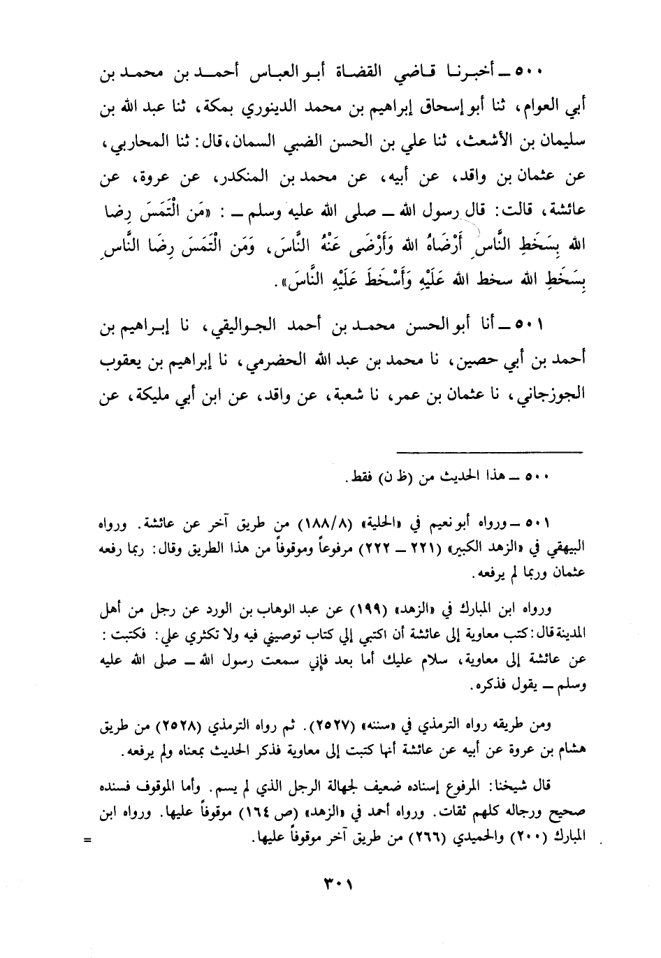 501 - أنا أَبُو الْحَسَنِ مُحَمَّدُ بْنُ أَحْمَدَ الْجَوَالِيقِيُّ، نا إِبْرَاهِيمُ بْنُ أَحْمَدَ بْنِ أَبِي حُصَيْنٍ، نا مُحَمَّدُ بْنُ عَبْدِ اللَّهِ الْحَضْرَمِيُّ، نا إِبْرَاهِيمُ بْنُ يَعْقُوبَ الْجُوزْجَانِيُّ، نا عُثْمَانُ بْنُ عُمَرَ، نا شُعْبَةُ، عَنْ وَاقِدٍ، عَنِ ابْنِ أَبِي مُلَيْكَةَ، عَنِ الْقَاسِمِ , عَنْ عَائِشَةَ، أَنَّ النَّبِيَّ صَلَّى اللهُ عَلَيْهِ وَسَلَّمَ قَالَ: «§مَنْ أَرْضَى اللَّهَ بِسَخَطِ النَّاسِ كَفَاهُ النَّاسَ، وَمَنْ أَسْخَطَ اللَّهَ بِرِضَا النَّاسِ وَكَلَهُ اللَّهُ إِلَى النَّاسِ»