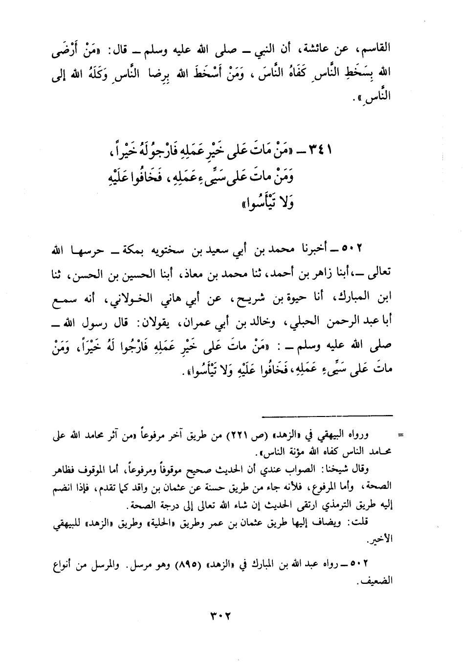 502 - أَخْبَرَنَا مُحَمَّدُ بْنُ أَبِي سَعِيدِ بْنِ سَخْتَوَيْهِ، بِمَكَّةَ حَرَسَهَا اللَّهُ تَعَالَى، أبنا زَاهِرُ بْنُ أَحْمَدَ، ثنا مُحَمَّدُ بْنُ مُعَاذٍ، أبنا الْحُسَيْنُ بْنُ الْحَسَنِ، ثنا ابْنُ الْمُبَارَكِ، أنا حَيْوَةُ بْنُ شُرَيْحٍ، عَنْ أَبِي هَانِي الْخَوْلَانِيِّ، أَنَّهُ سَمِعَ أَبَا عَبْدِ الرَّحْمَنِ الْحُبُلِيَّ وَخَالِدَ بْنَ أَبِي عِمْرَانَ، يَقُولَانِ: قَالَ رَسُولُ اللَّهِ صَلَّى اللهُ عَلَيْهِ وَسَلَّمَ: «§مَنْ مَاتَ عَلَى خَيْرِ عَمَلِهِ فَأَرْجُو لَهُ خَيْرًا، وَمَنْ مَاتَ عَلَى سَيِّئِ عَمَلِهِ فَخَافُوا عَلَيْهِ وَلَا تَيْأَسُوا»